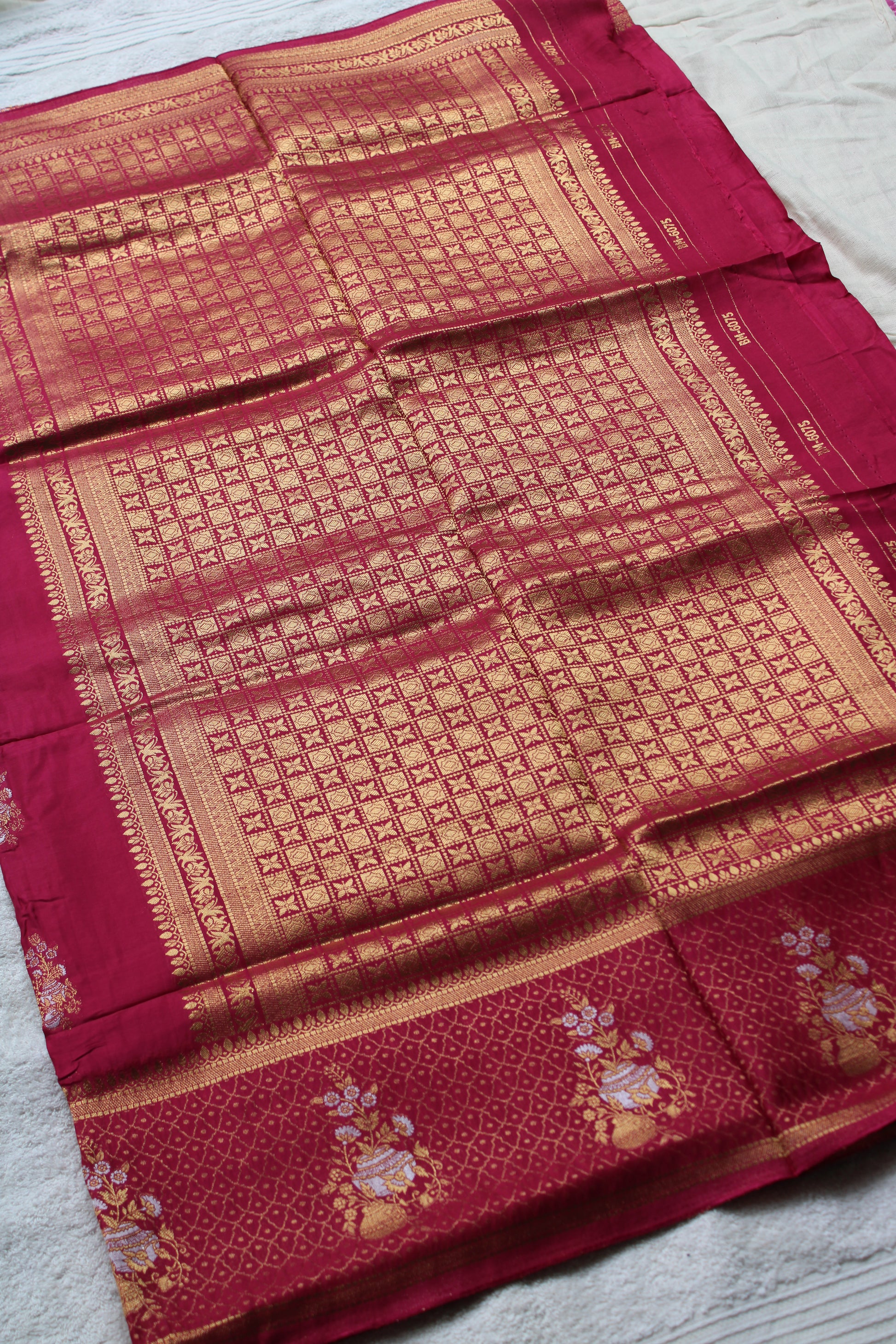 This elegant Pink Banarasi Russian crape saree blends traditional craftsmanship with contemporary style. Featuring a refined checked and floral border, it offers a subtle yet distinctive charm. The soft Russian crape fabric provides graceful drape and comfort, making it an excellent choice for festive occasions or formal events. Experience the timeless allure of Banarasi weaving enhanced by a unique texture and detailed border work.