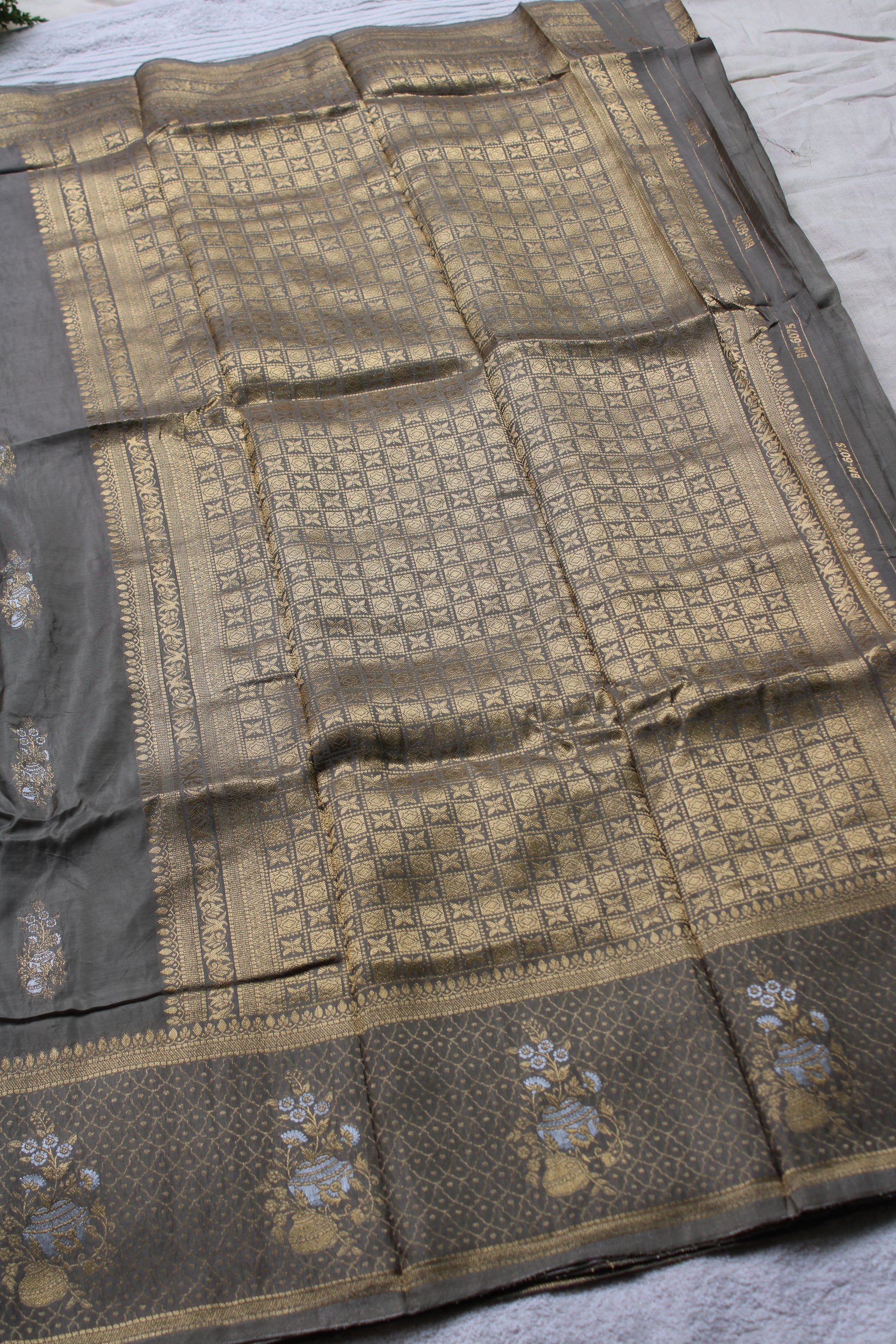This elegant Ash green Banarasi Russian crape saree blends traditional craftsmanship with contemporary style. Featuring a refined checked and floral border, it offers a subtle yet distinctive charm. The soft Russian crape fabric provides graceful drape and comfort, making it an excellent choice for festive occasions or formal events. Experience the timeless allure of Banarasi weaving enhanced by a unique texture and detailed border work.