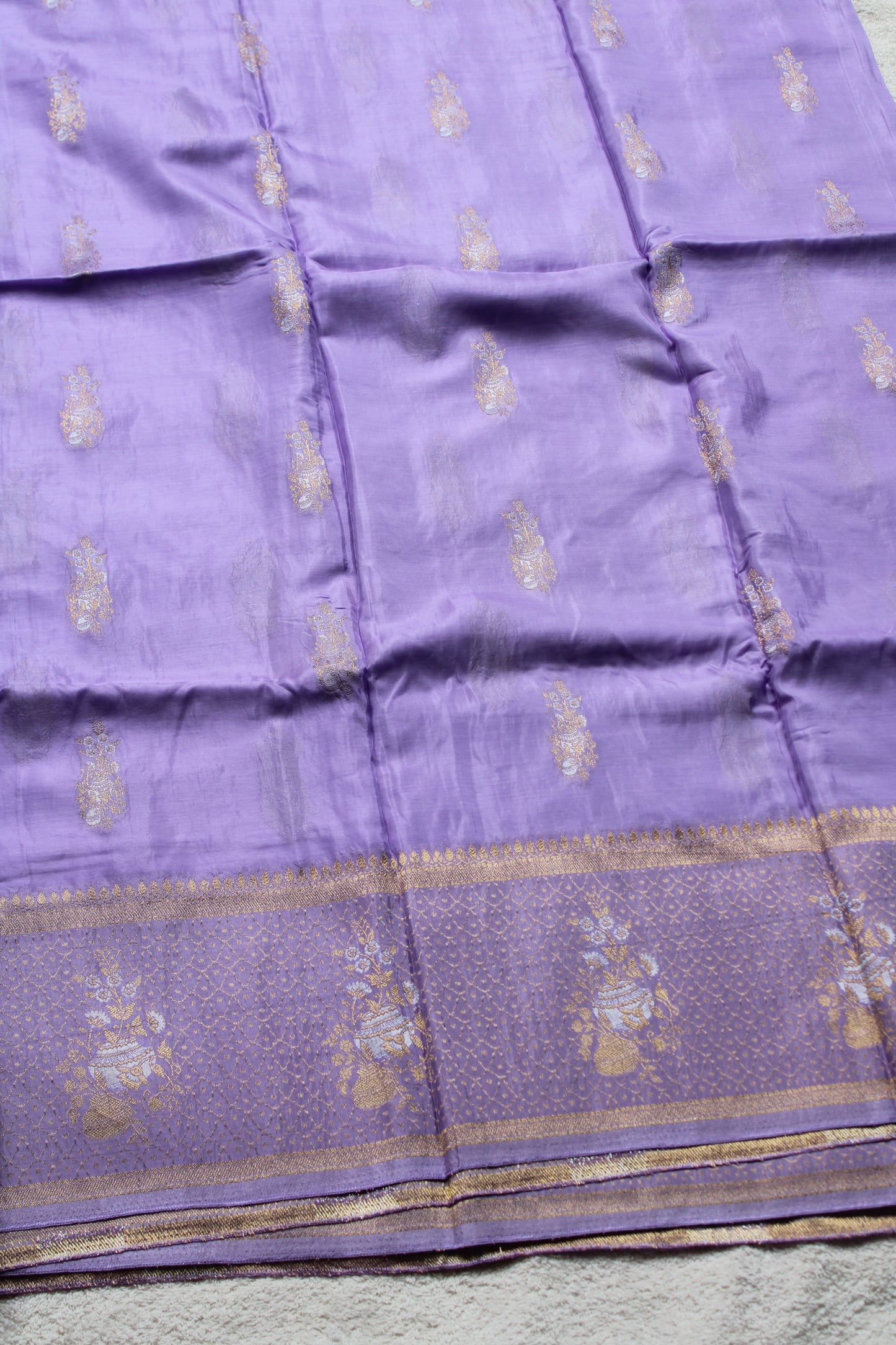 This elegant Lavender Banarasi Russian crape saree blends traditional craftsmanship with contemporary style. Featuring a refined checked and floral border, it offers a subtle yet distinctive charm. The soft Russian crape fabric provides graceful drape and comfort, making it an excellent choice for festive occasions or formal events. Experience the timeless allure of Banarasi weaving enhanced by a unique texture and detailed border work.