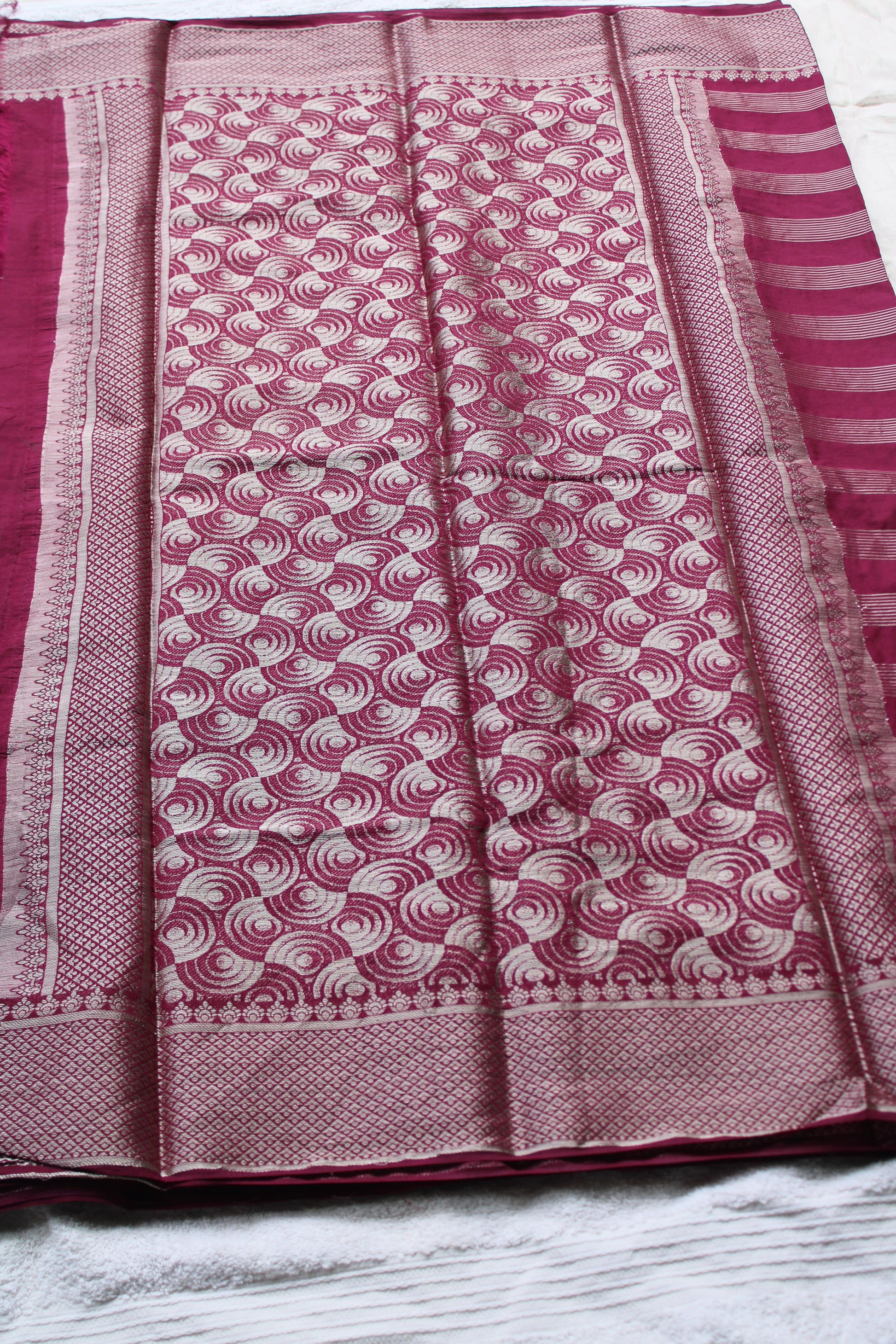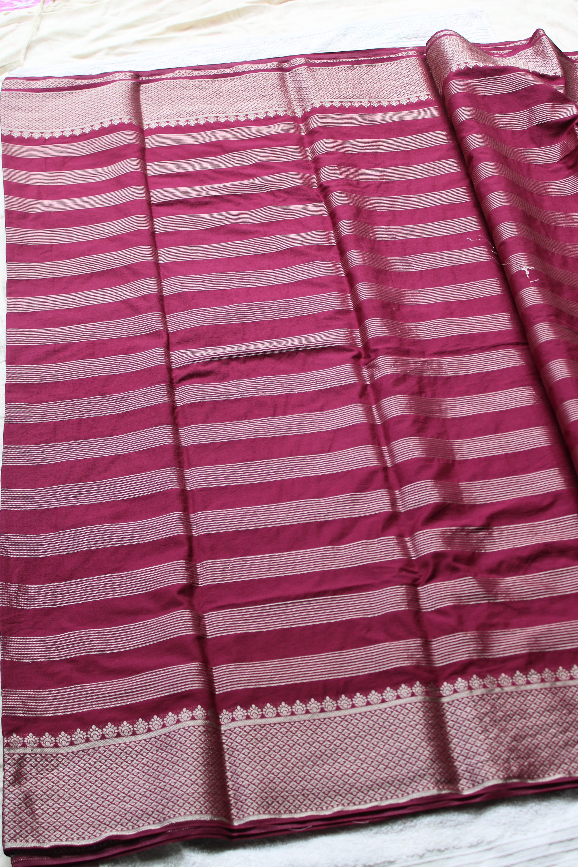 This maroon viscose crape silk saree features elegant zari weaving with horizontal lines throughout, complemented by a delicate small zari border and floral buttas on the blouse. Its lightweight fabric ensures comfort and ease of draping, making it an ideal choice for festive occasions. The intricate zari work adds a refined touch, blending traditional craftsmanship with contemporary style.