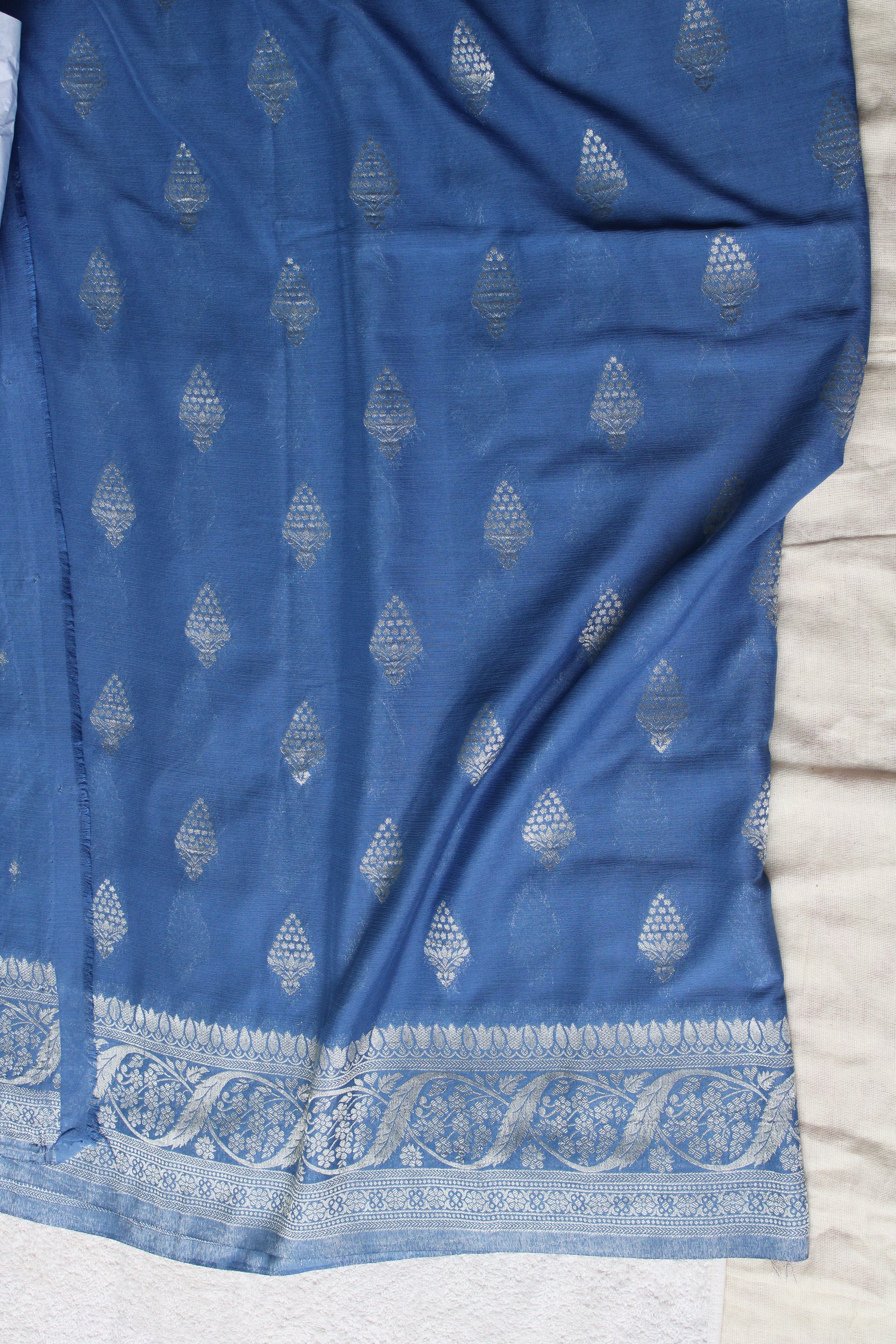 Elevate your wardrobe with this Blue Banarasi Mashru crape georgette saree, featuring an elegant butta design. Crafted from a blend that offers the rich texture of Banarasi with the lightweight comfort of georgette, this saree drapes effortlessly, making it ideal for both traditional occasions and contemporary style. Its breathable fabric ensures easy wear throughout the day, while the timeless floral pattern keeps you effortlessly fashionable. A perfect balance of heritage craftsmanship and modern appeal.