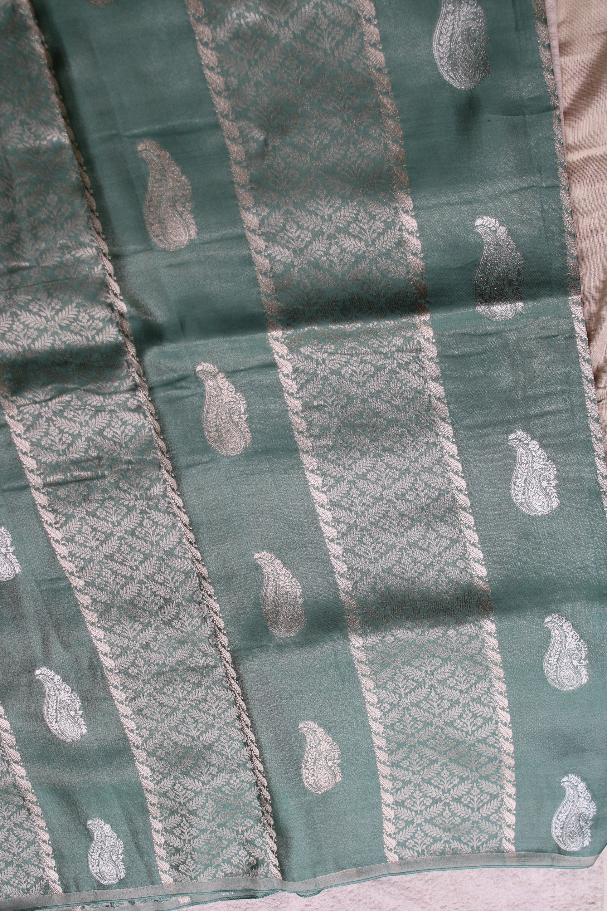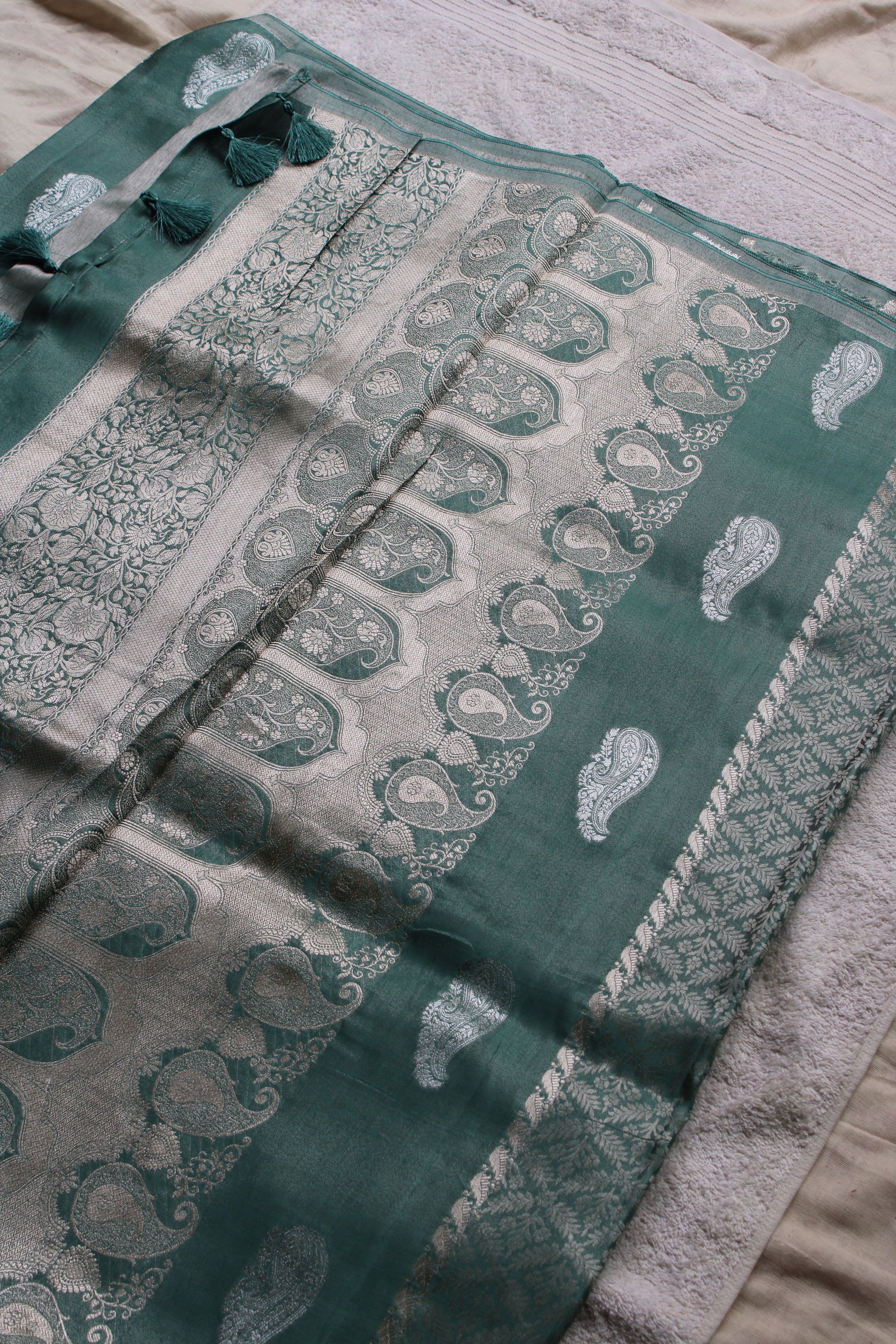 Elevate your festive wardrobe with the Green Banarasi Mashroo tissue silk saree, renowned for its superior quality and intricate craftsmanship. This lightweight saree combines the elegance of Banarasi weaving with the trendy Mashroo fabric, making it ideal for weddings and special occasions. Its vibrant hues and delicate texture offer both comfort and sophistication, ensuring you look stunning while enjoying ease of wear throughout the event. Perfect for connoisseurs of traditional silk with a contemporary appeal.
