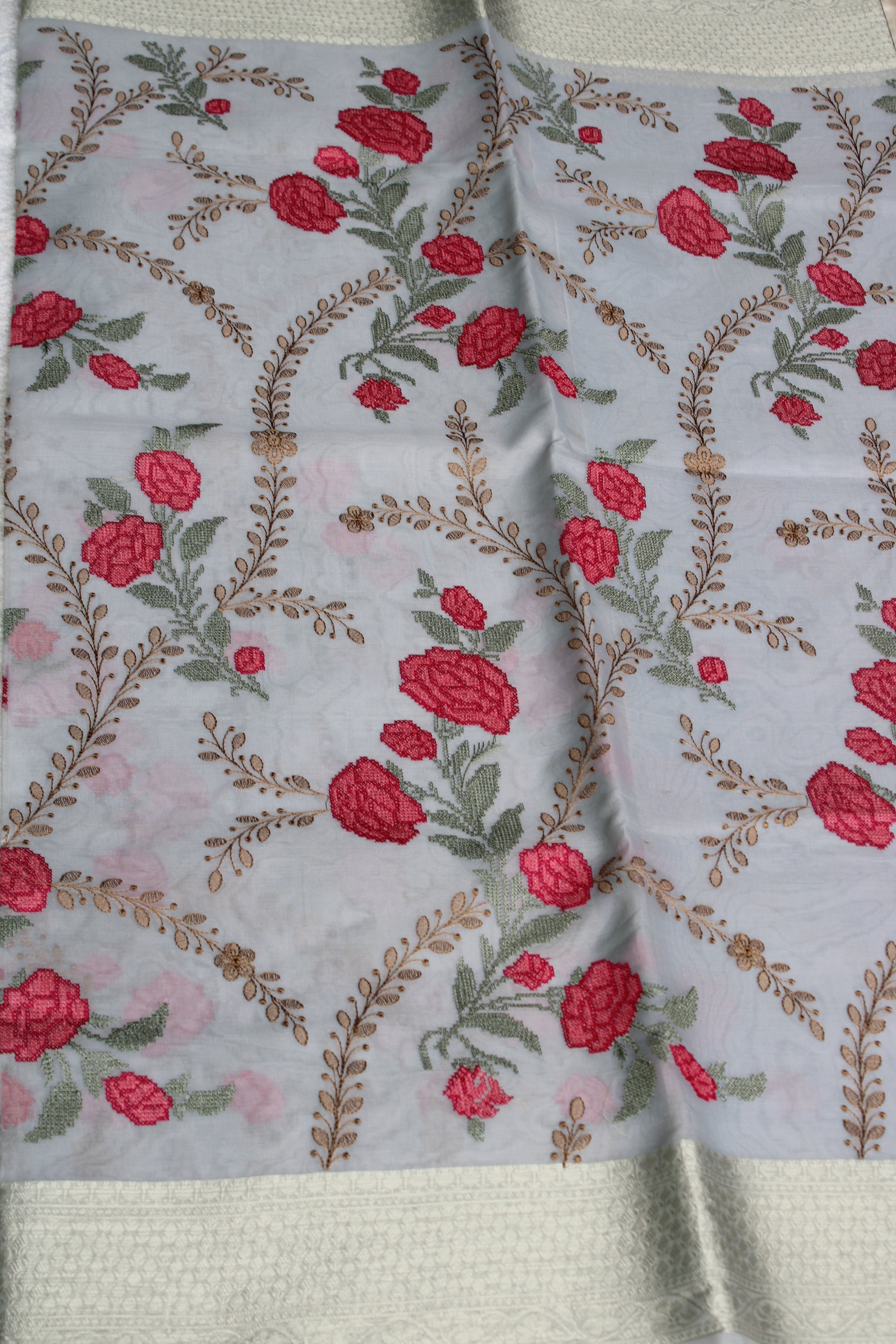 This light grey organza saree showcases exquisite Parsi embroidery, perfected with a delicate Zari border that adds a subtle shimmer. The lightweight organza fabric ensures graceful draping and comfort, making it ideal for formal occasions. Expertly crafted, the saree combines traditional craftsmanship with elegant design, offering a sophisticated statement piece for your wardrobe.