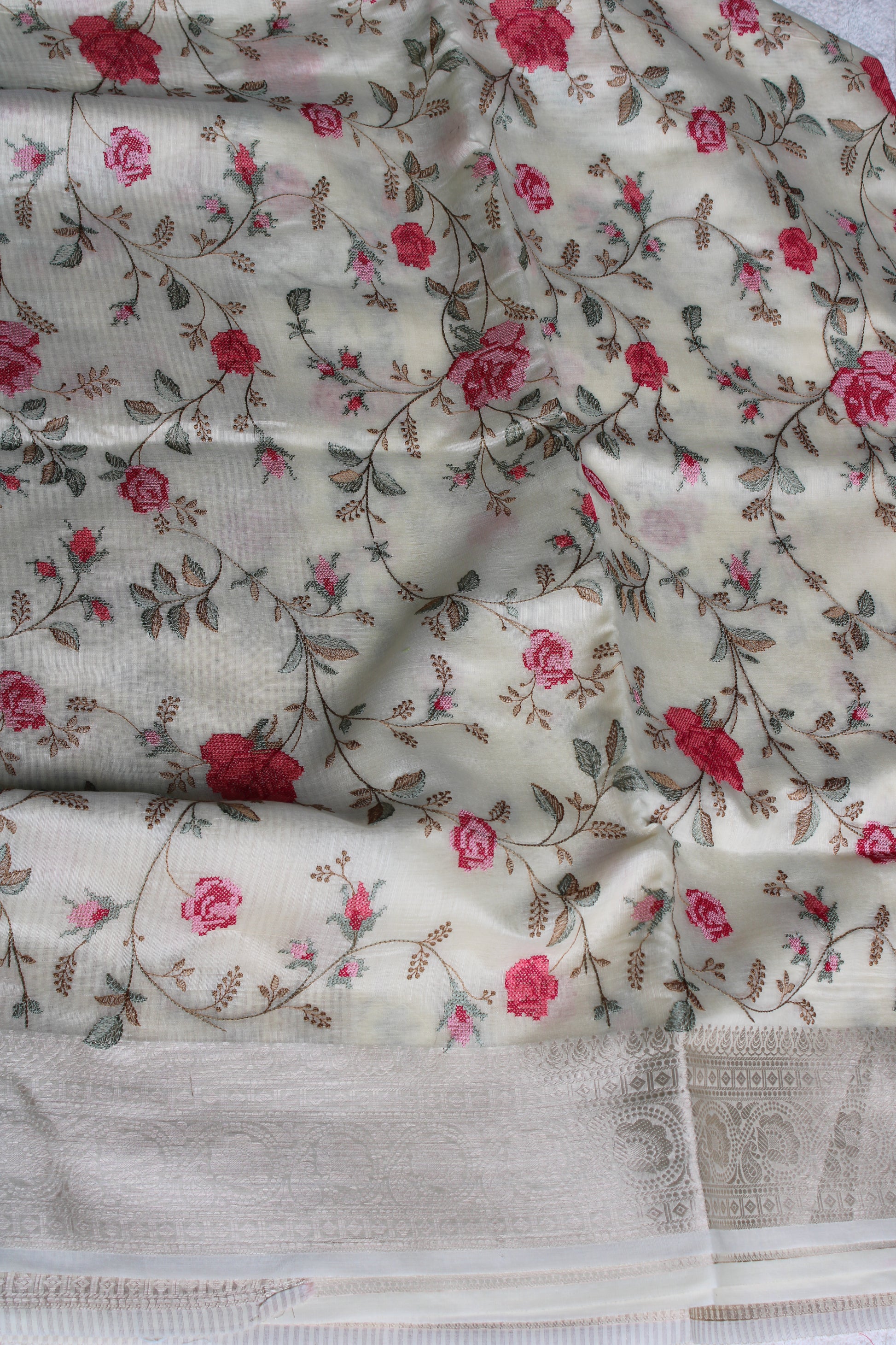 Beige Lenin silk saree with Banarasi parsi work and zari border