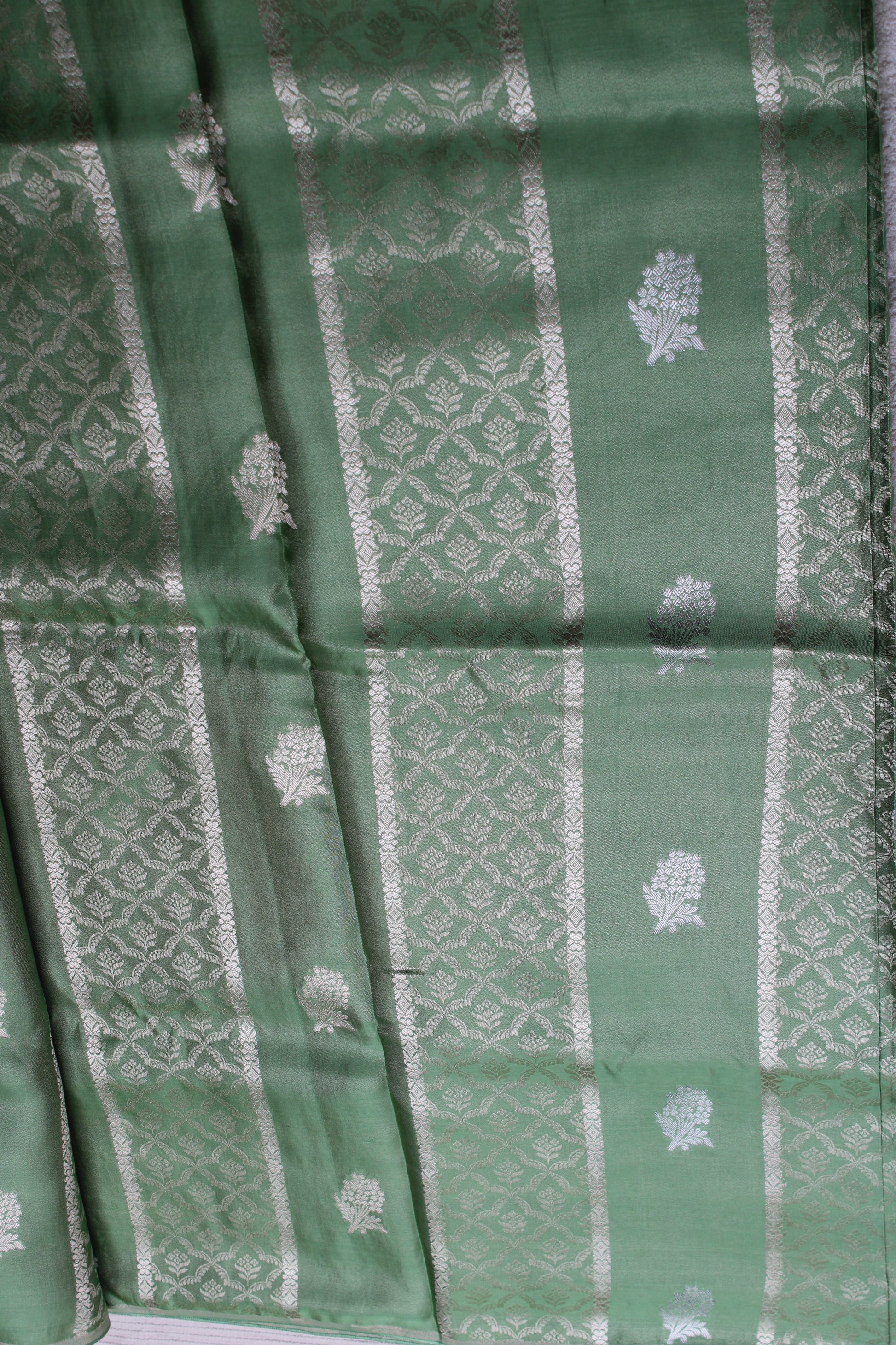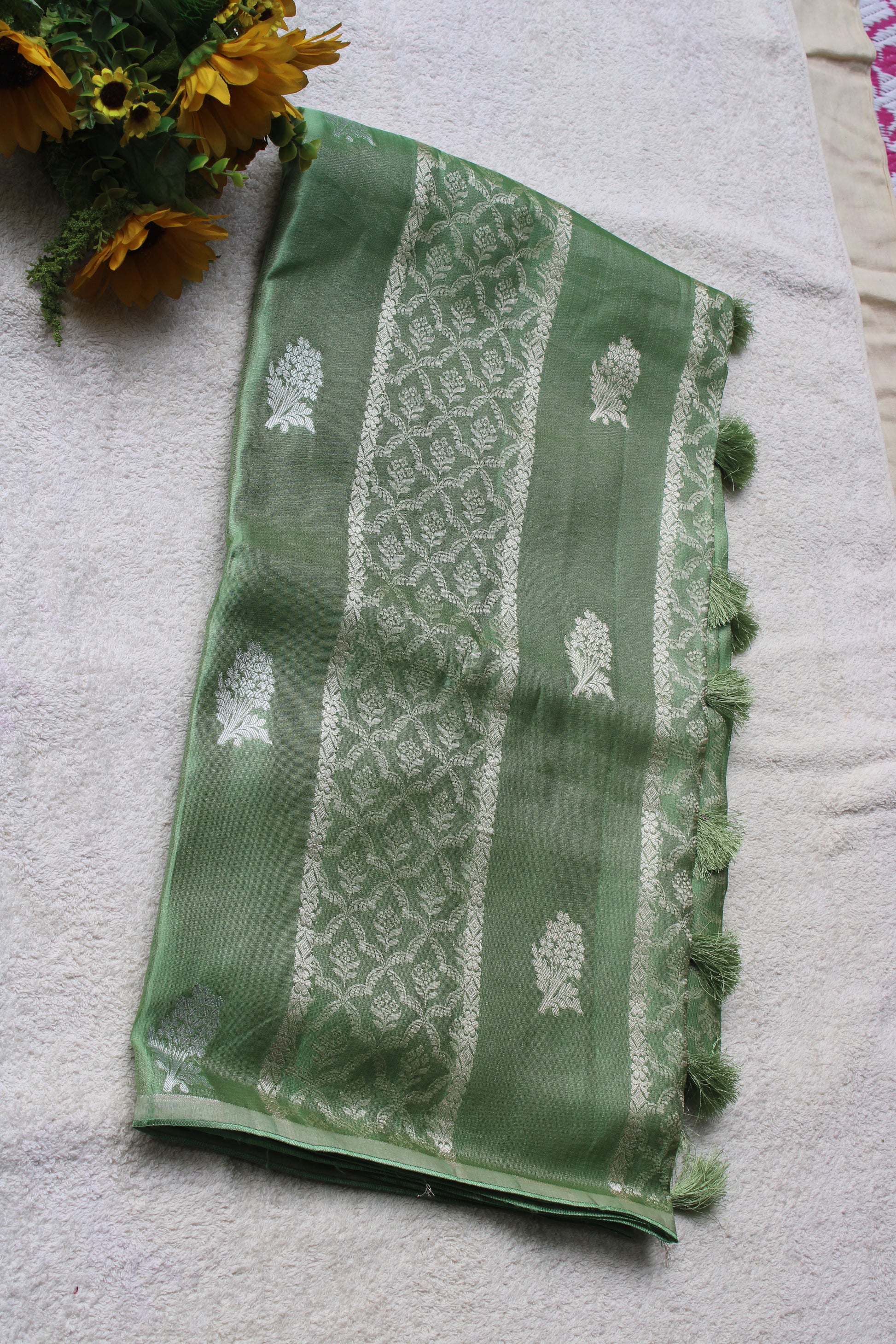 Elevate your festive wardrobe with the Green Banarasi Mashroo tissue silk saree, renowned for its superior quality and intricate craftsmanship. This lightweight saree combines the elegance of Banarasi weaving with the trendy Mashroo fabric, making it ideal for weddings and special occasions. Its vibrant hues and delicate texture offer both comfort and sophistication, ensuring you look stunning while enjoying ease of wear throughout the event. Perfect for connoisseurs of traditional silk with a contemporary appeal.