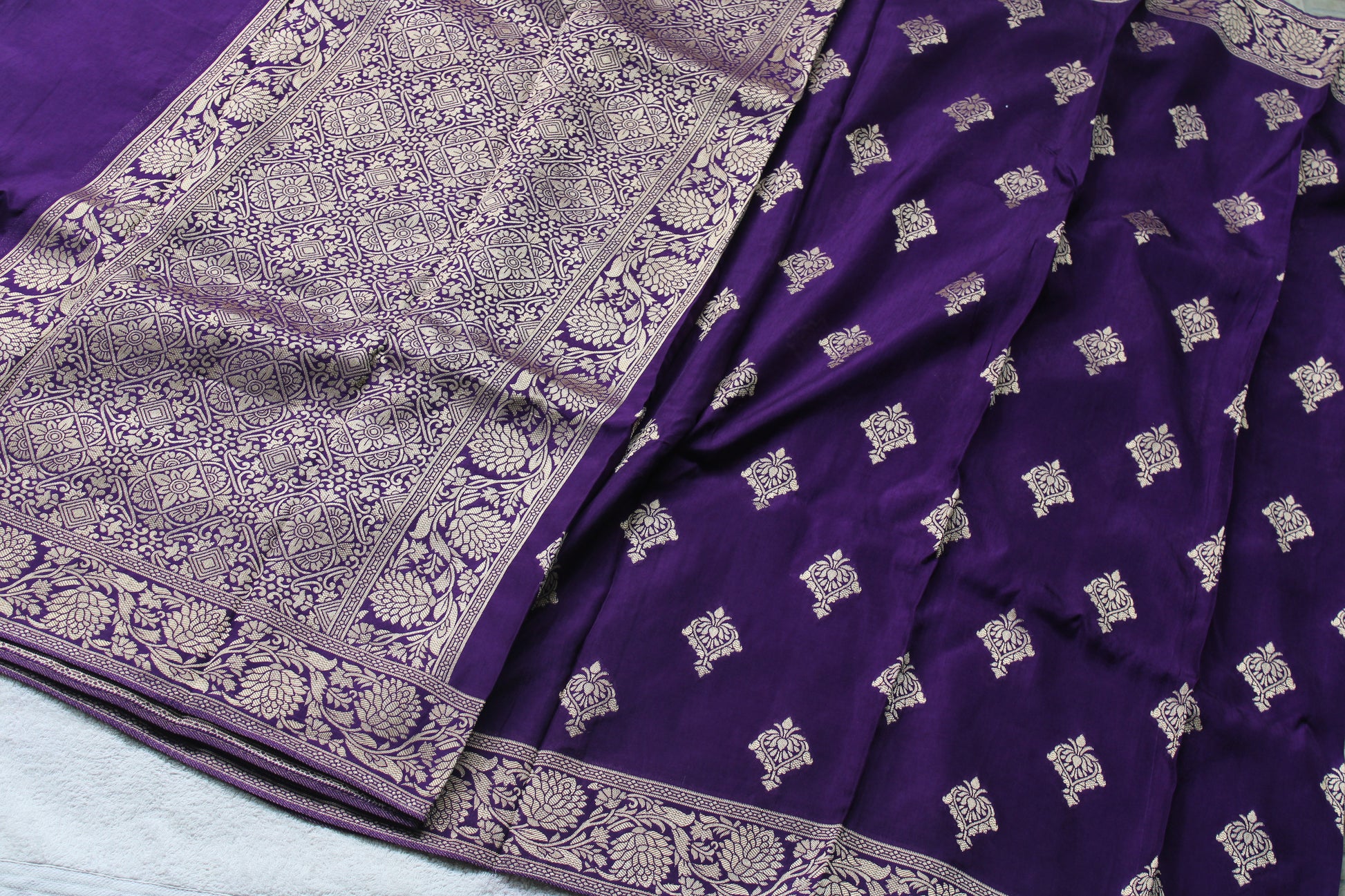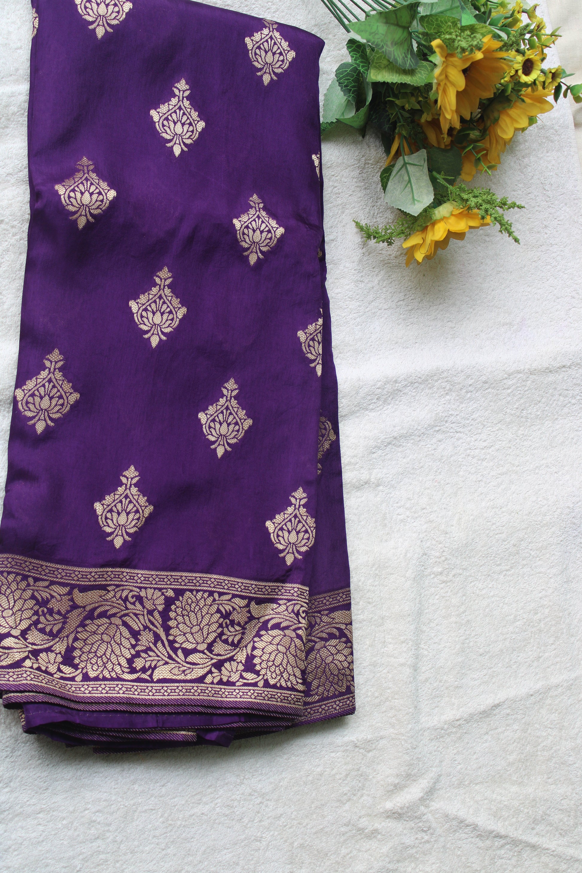 This Banarasi purple saree features a delicate, trending small border that adds subtle elegance. Adorned with newly designed flower motifs, it blends traditional craftsmanship with contemporary style, making it an exquisite choice for festive occasions and celebrations. The rich purple hue enhances its regal appeal, while the intricate detailing showcases expert artistry. Perfect for those seeking a timeless yet modern saree.