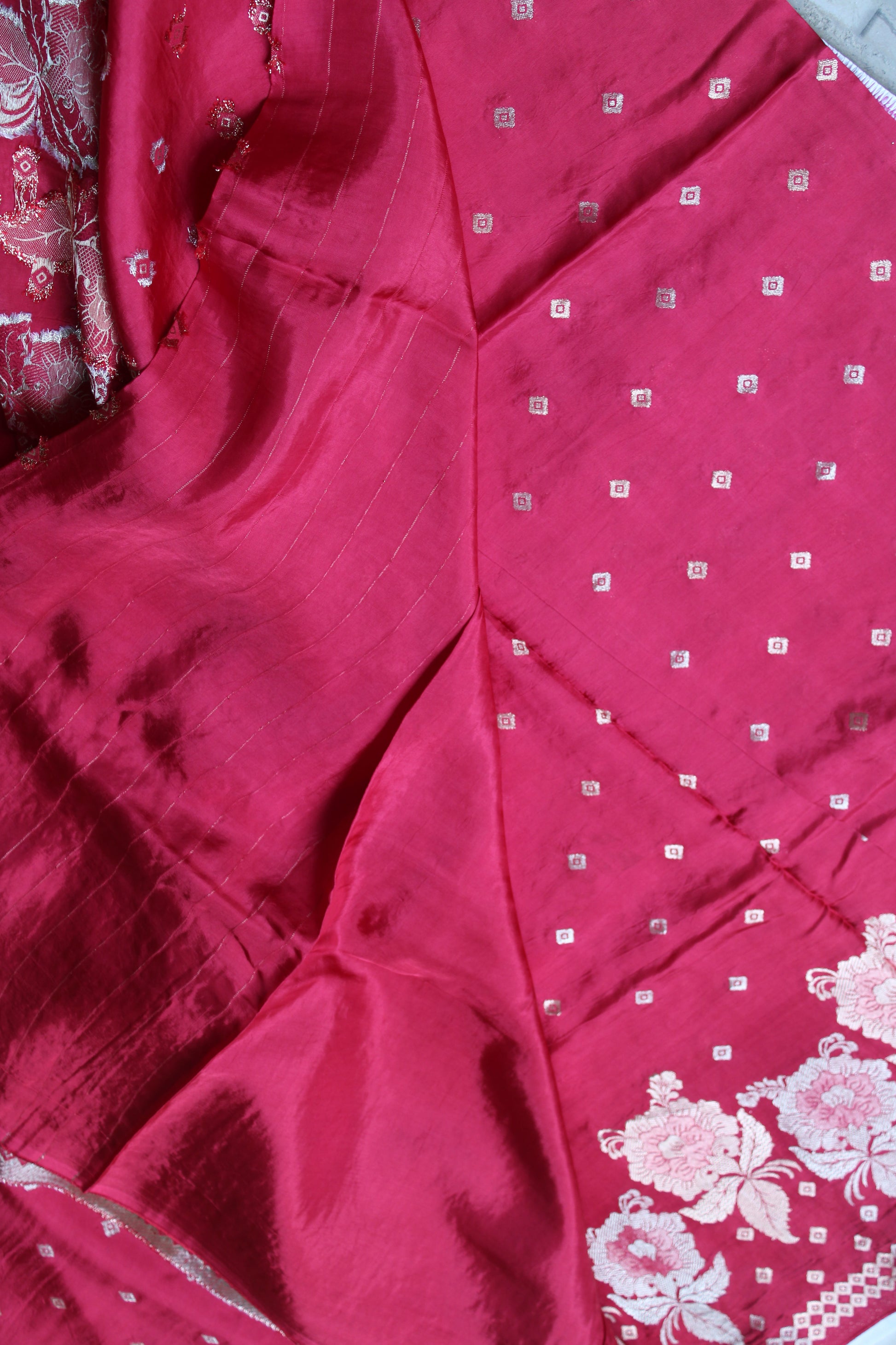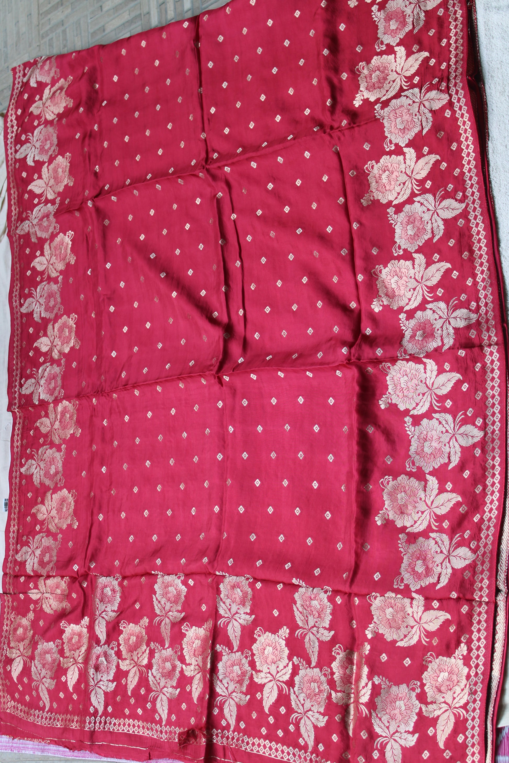 This tomato red pure crape silk saree features an elegant rose flower border and delicate all-over buttas, blending traditional craftsmanship with a modern aesthetic. Its rich texture and refined design make it a sophisticated choice for those seeking a timeless yet contemporary look. Perfect for special occasions, this saree offers both grace and style in one exquisite ensemble.