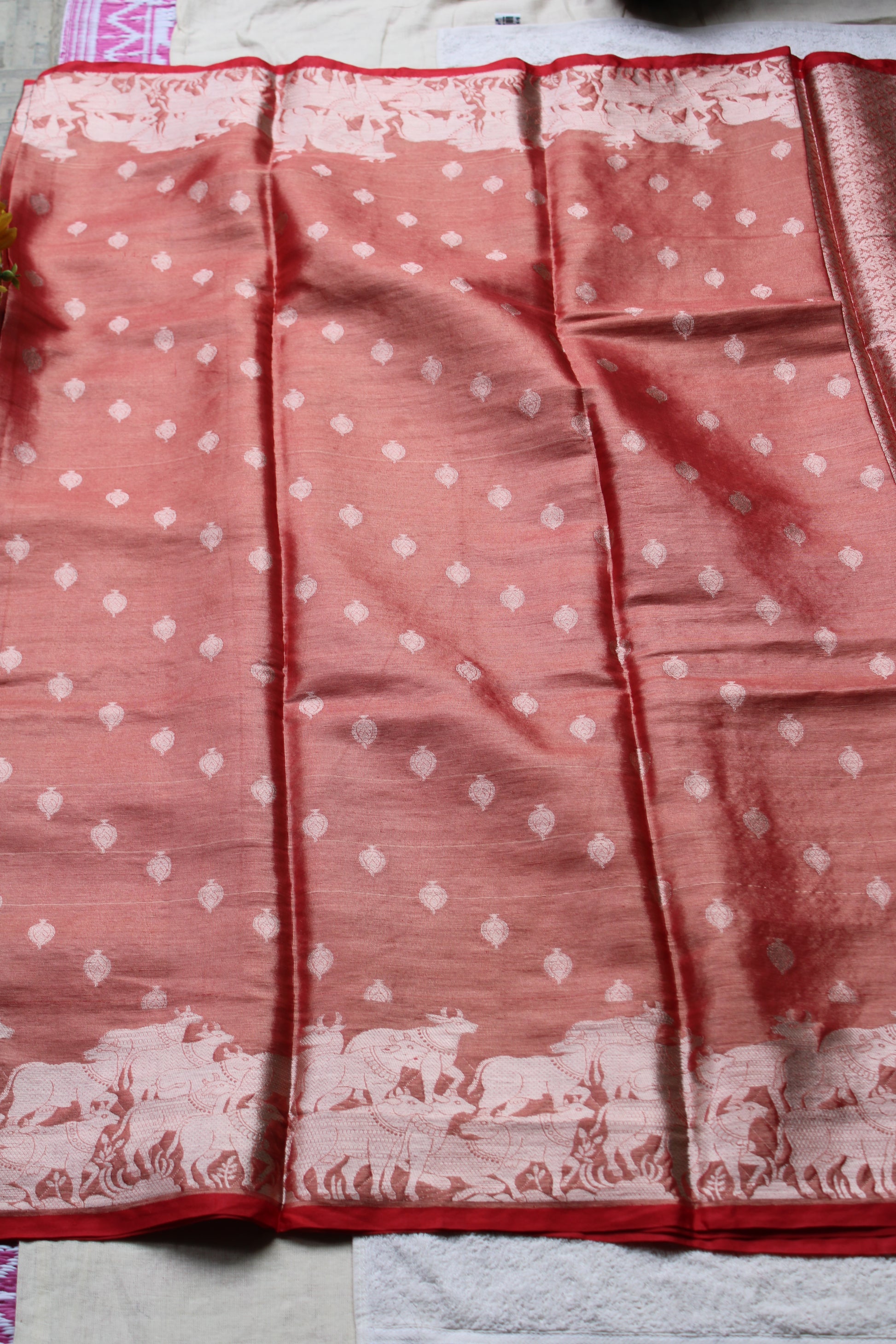 Red Banarasi tissue saree with pichwai border
