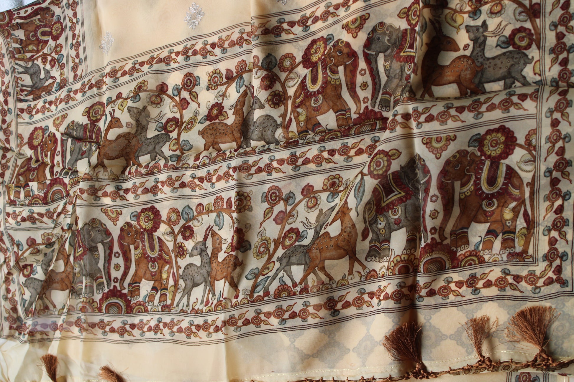 This pure organza saree features delicate embroidery with intricate figure motifs along the border, combining lightweight comfort with a rich, elegant appearance. Ideal for designer occasions, it offers a sophisticated and classy look that enhances your style effortlessly.