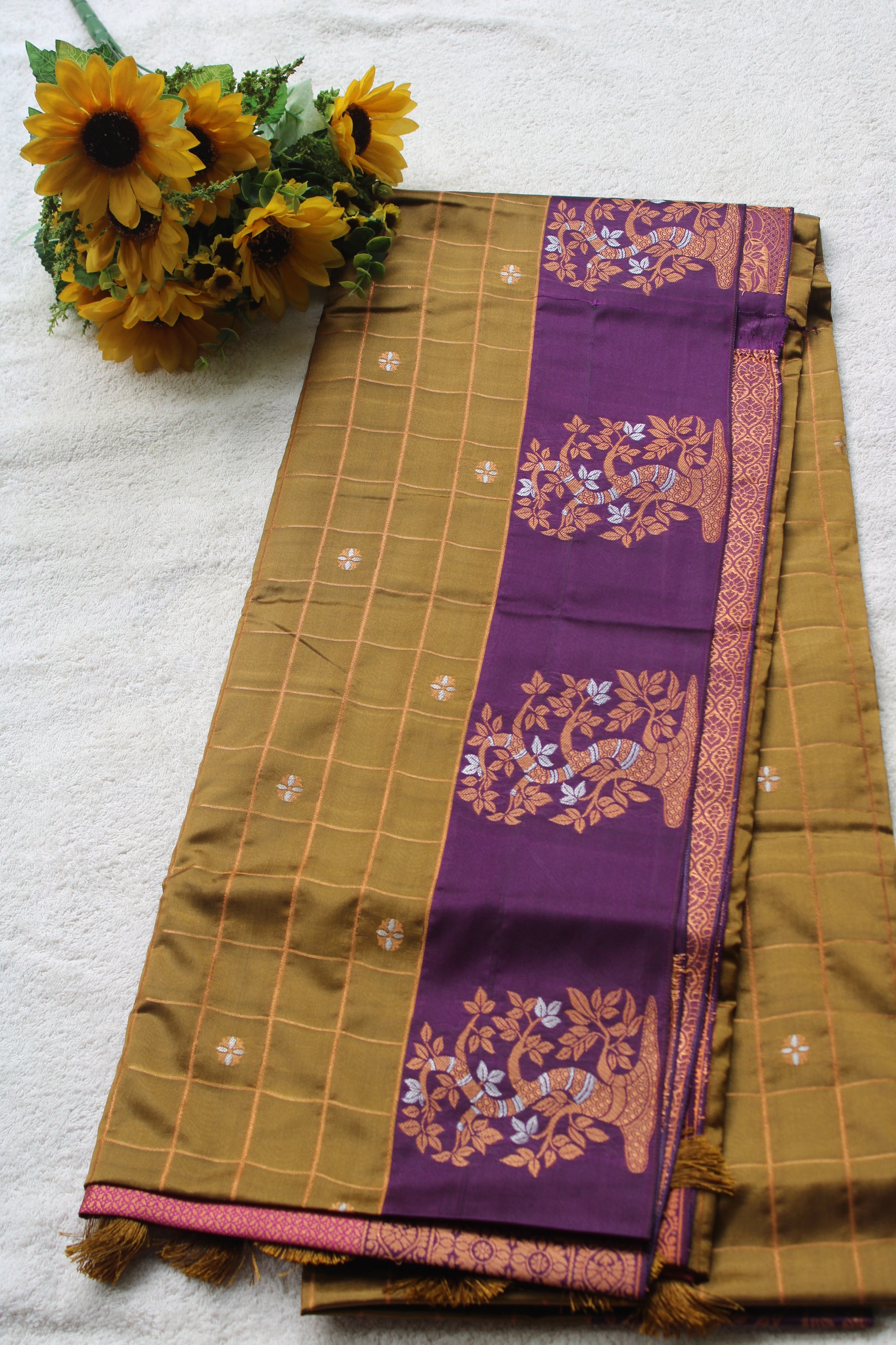 This copper-colored soft silk vintage saree features a lightweight fabric adorned with elegant zari-checked patterns and intricate flower zari weaving. Its contrasting Banarasi open border and rich floral brocade blouse enhance the traditional appeal, while the luxurious pallu adds a refined finishing touch. Perfect for those seeking a blend of classic craftsmanship and graceful style.