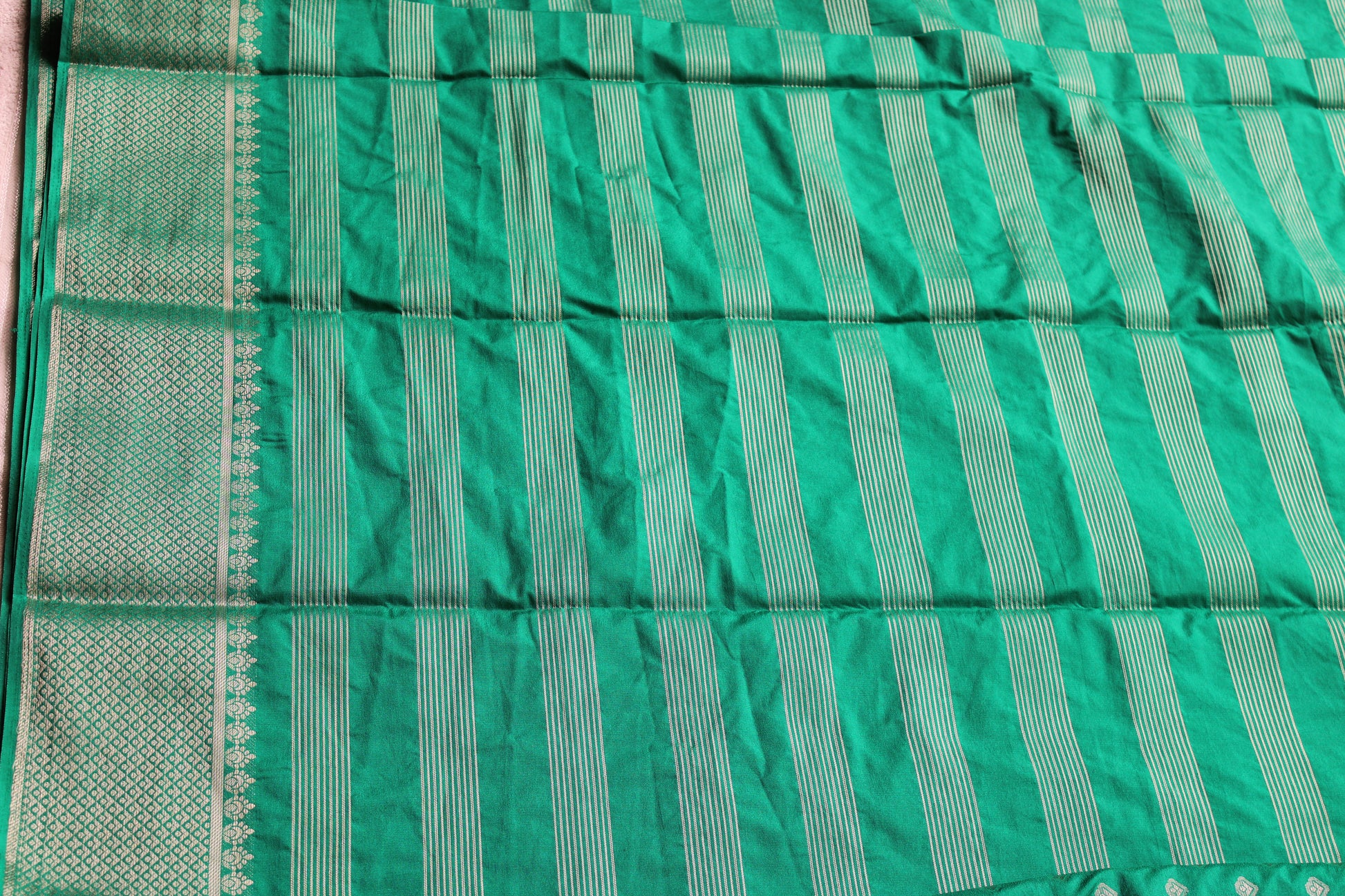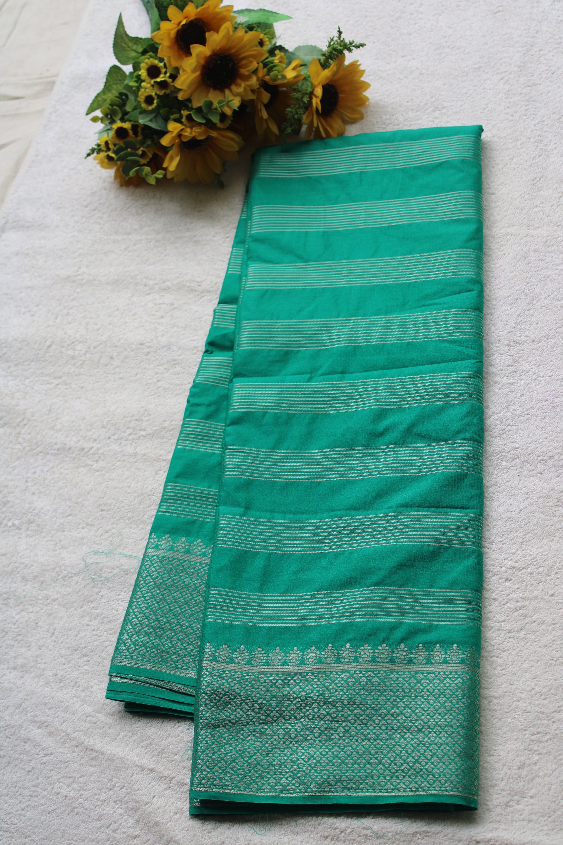 This green viscose crape silk saree features elegant zari weaving with horizontal lines throughout, complemented by a delicate small zari border and floral buttas on the blouse. Its lightweight fabric ensures comfort and ease of draping, making it an ideal choice for festive occasions. The intricate zari work adds a refined touch, blending traditional craftsmanship with contemporary style.