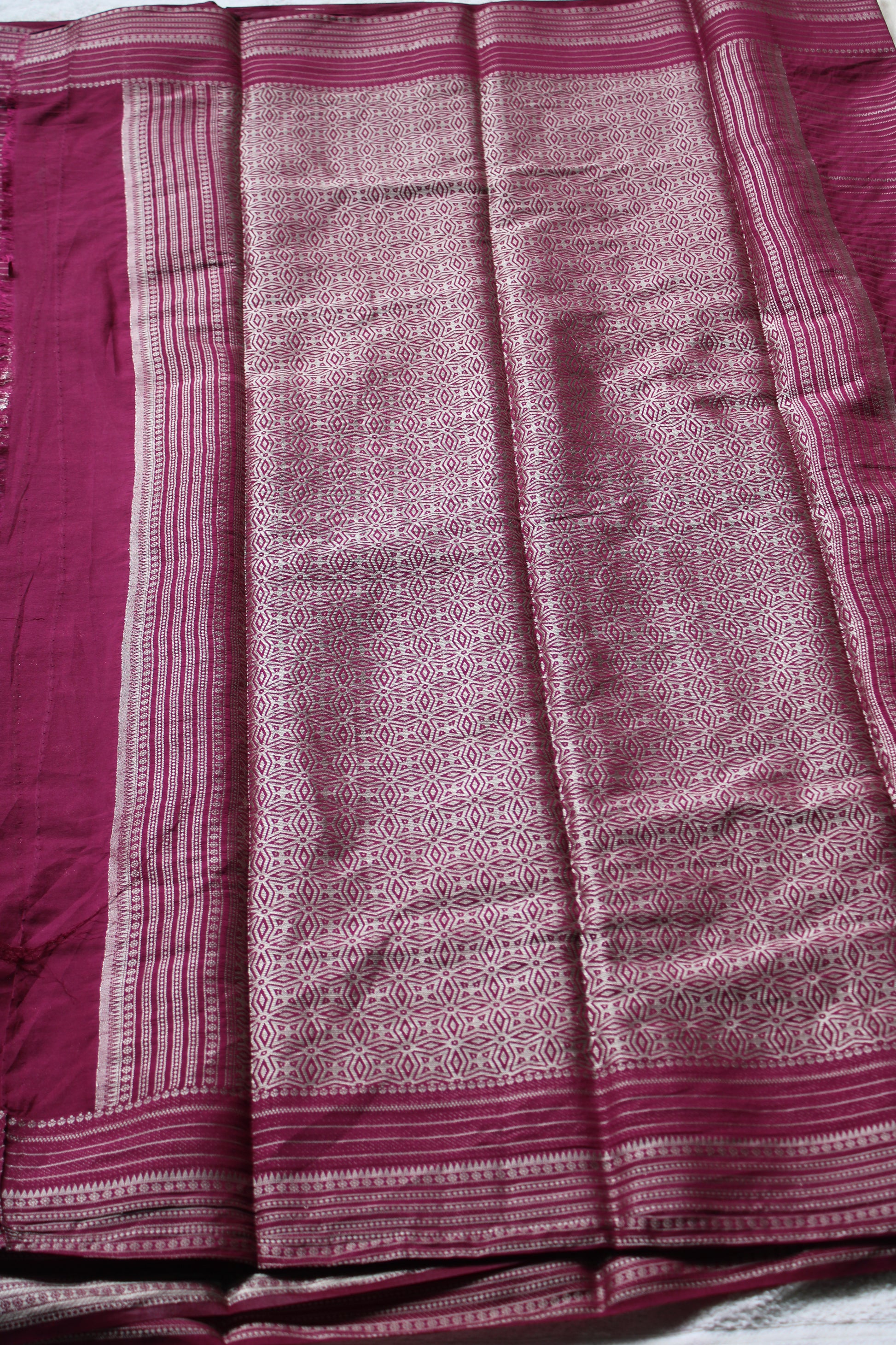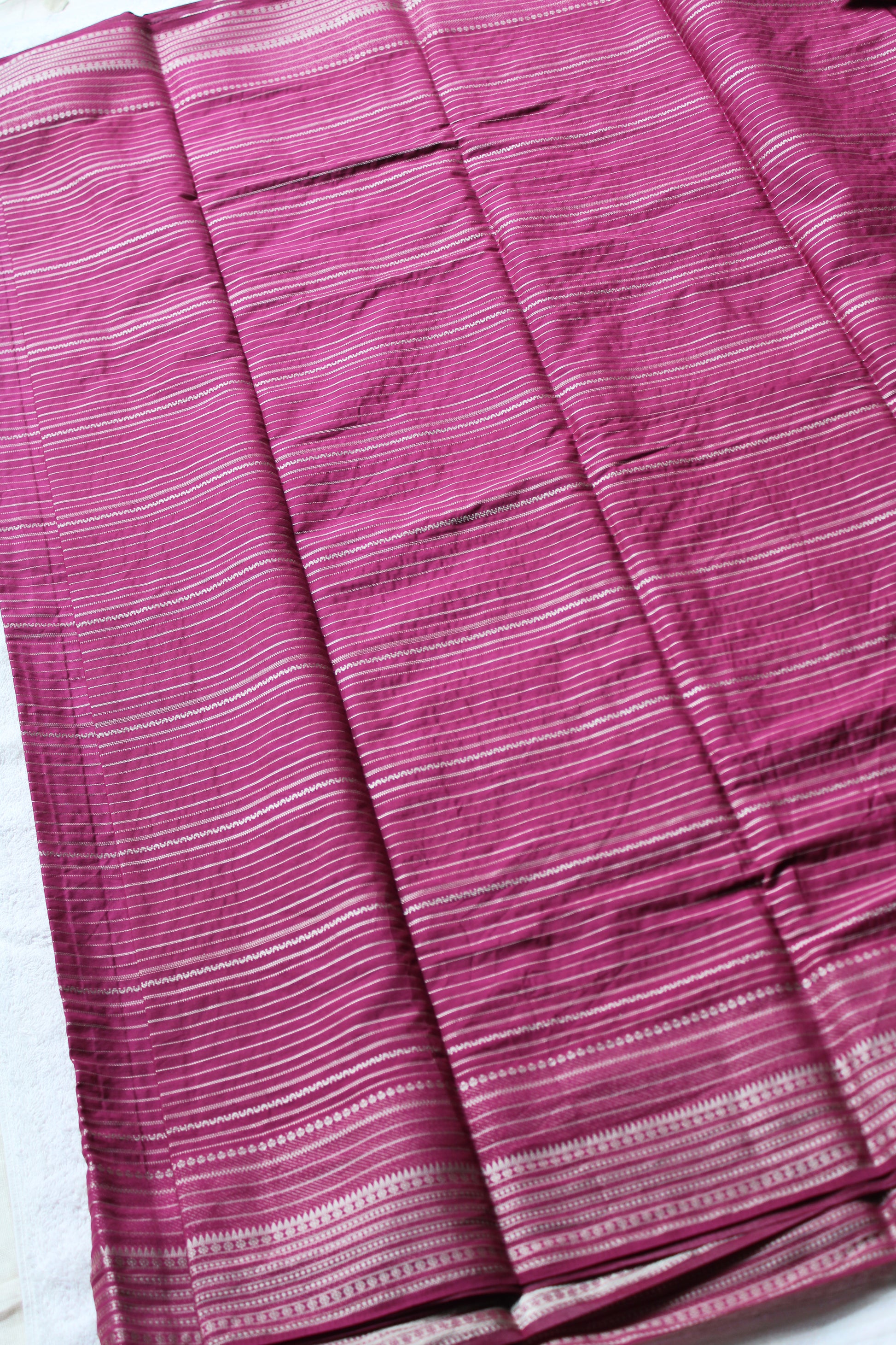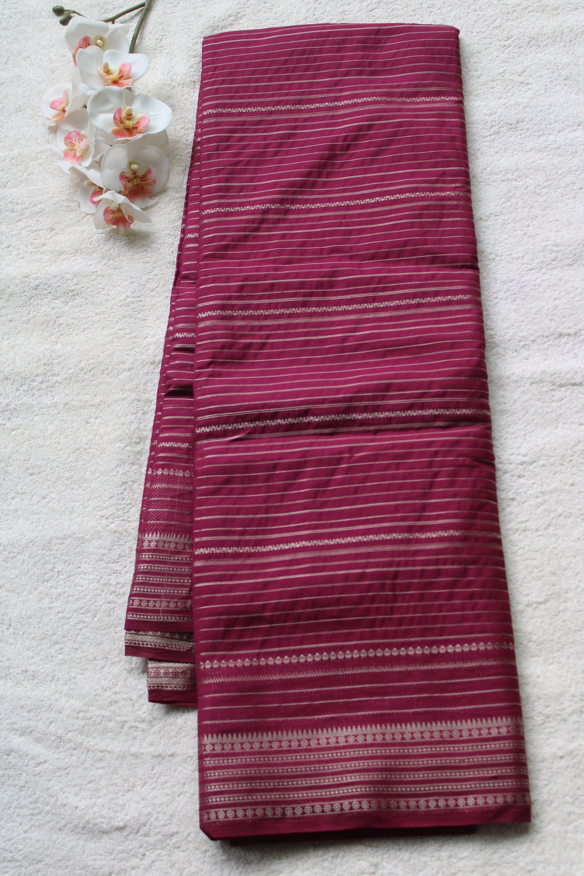 This maroon viscose crape silk saree features elegant zari weaving with horizontal lines throughout, complemented by a delicate small zari border and floral buttas on the blouse. Its lightweight fabric ensures comfort and ease of draping, making it an ideal choice for festive occasions. The intricate zari work adds a refined touch, blending traditional craftsmanship with contemporary style.
