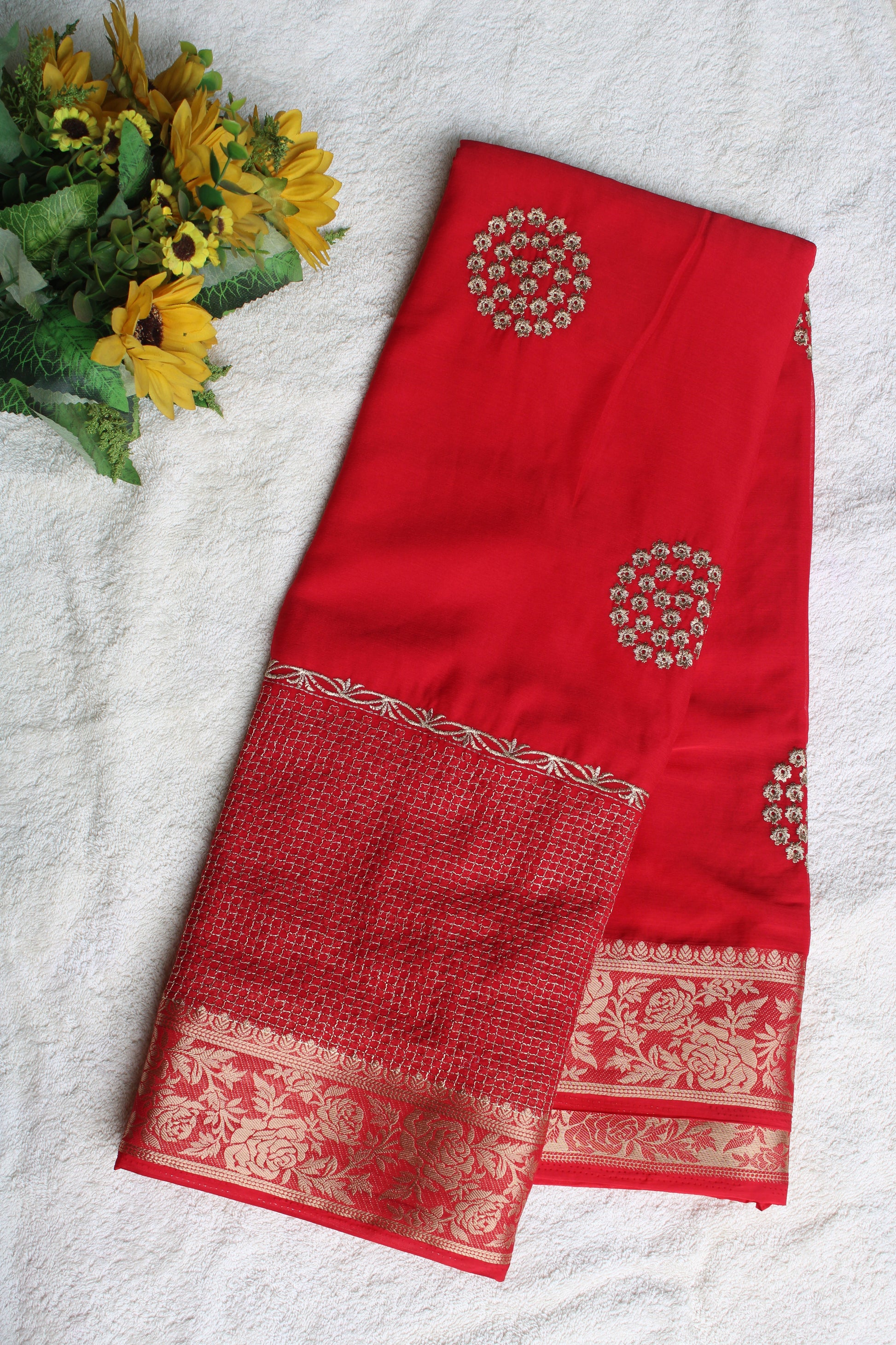 Red Double border viscous crape saree