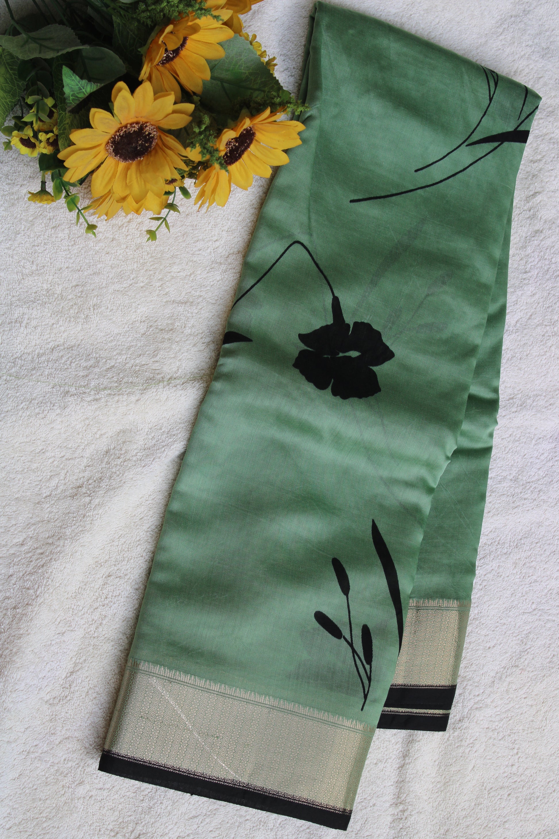 This elegant Green Tussar Crape saree features a delicate floral design, combining traditional fabric with contemporary style. The natural texture of tussar silk offers a lightweight, breathable feel, making it perfect for festive occasions or formal gatherings. Its graceful drape enhances silhouette, while the floral patterns add a subtle charm, reflecting expert craftsmanship and timeless appeal.