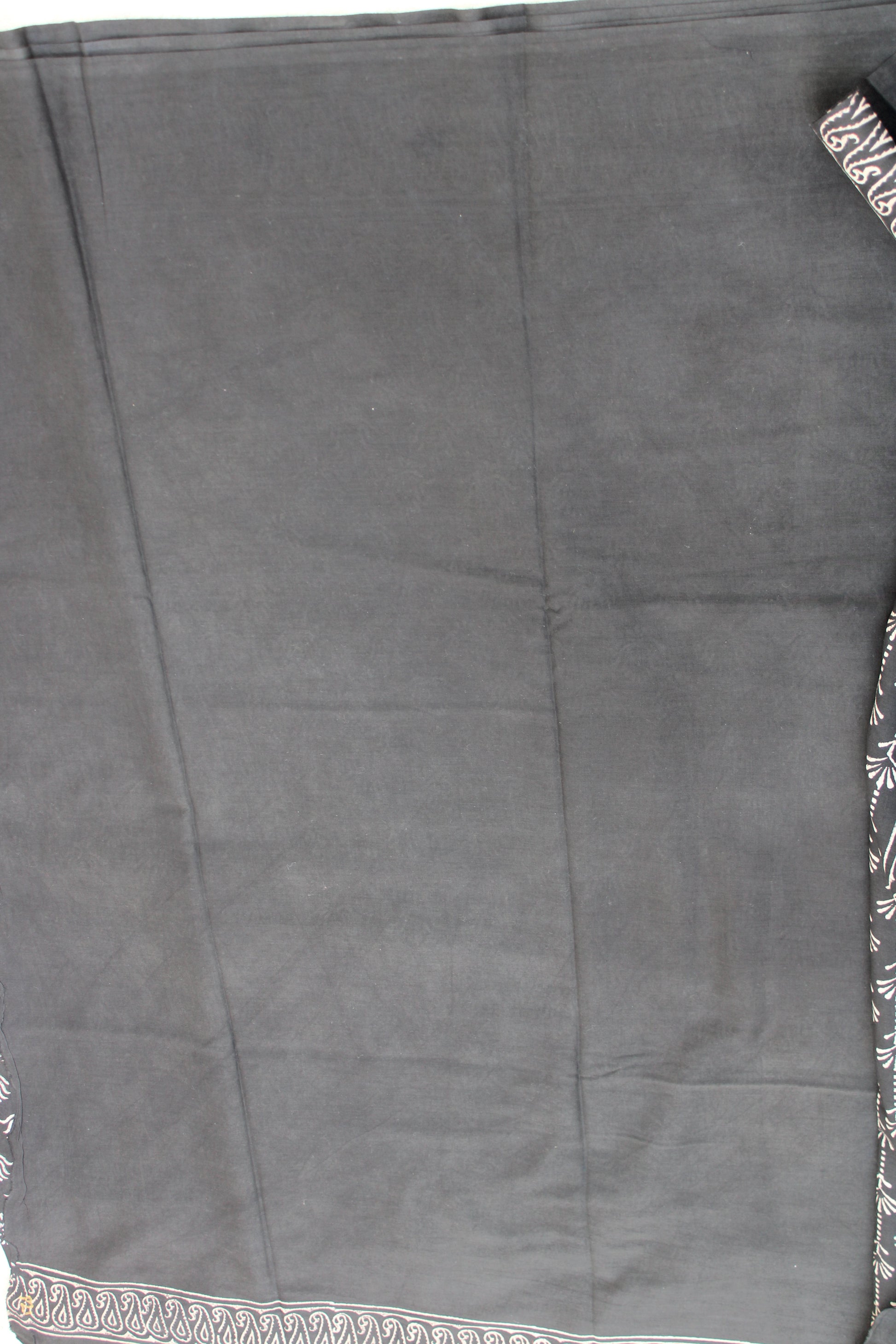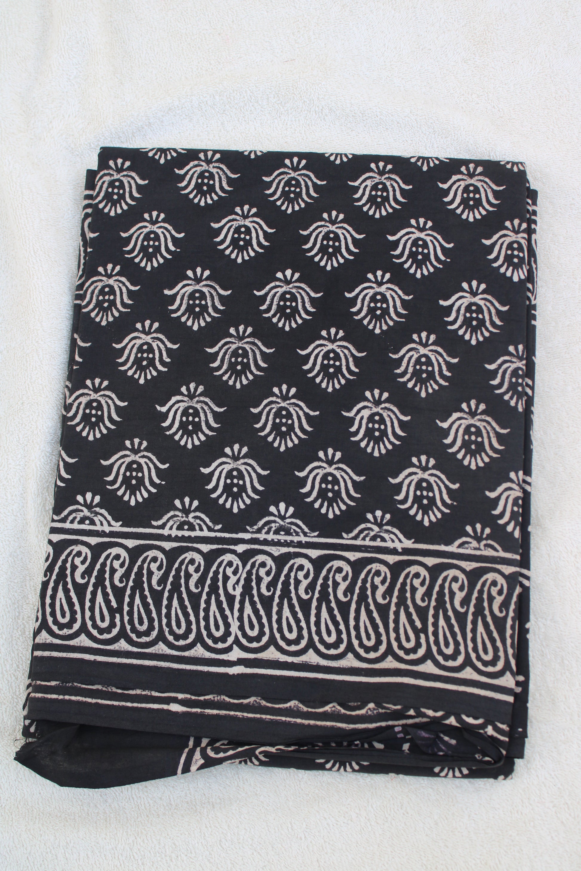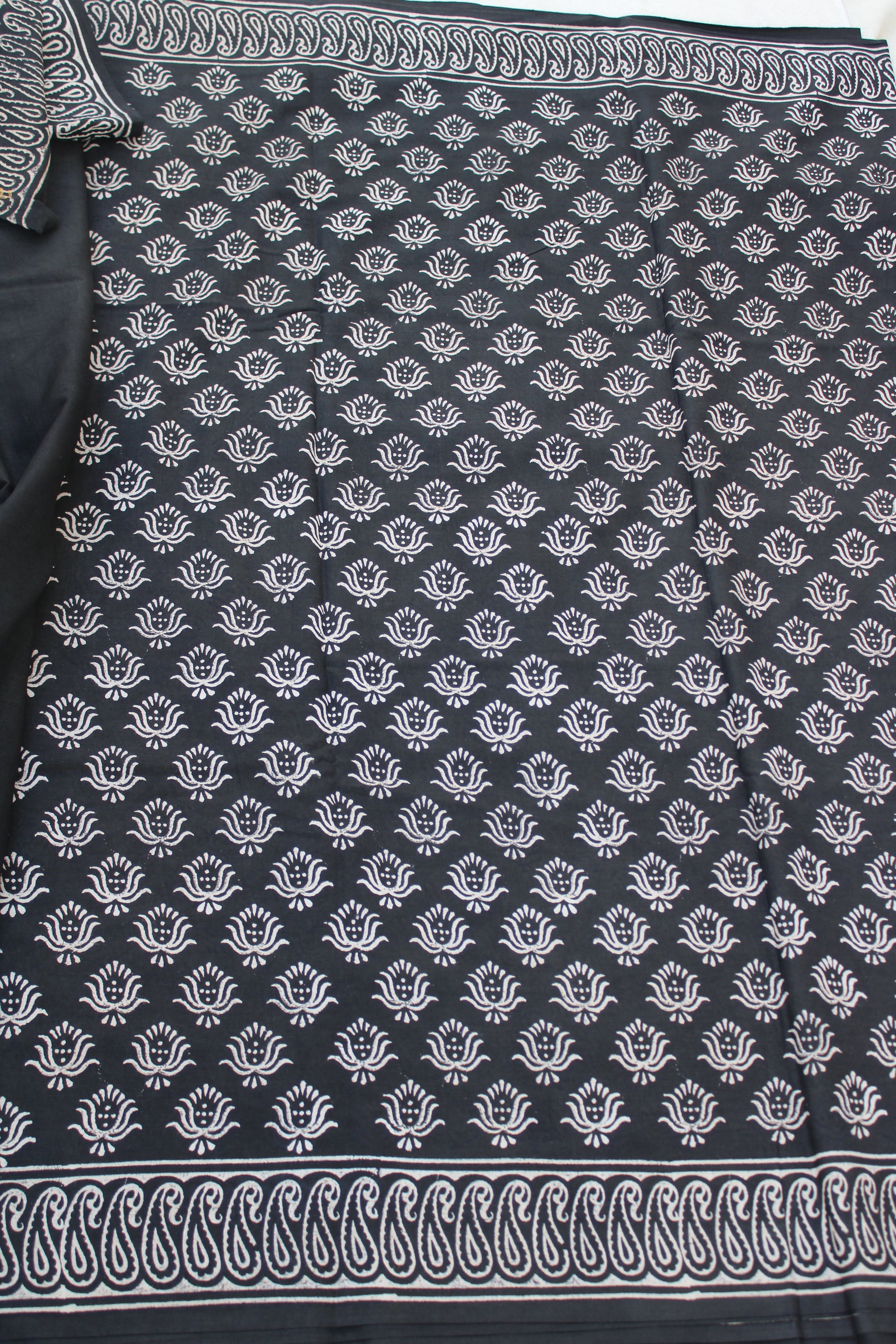 Black with white lotus hand block printed mul cotton saree
