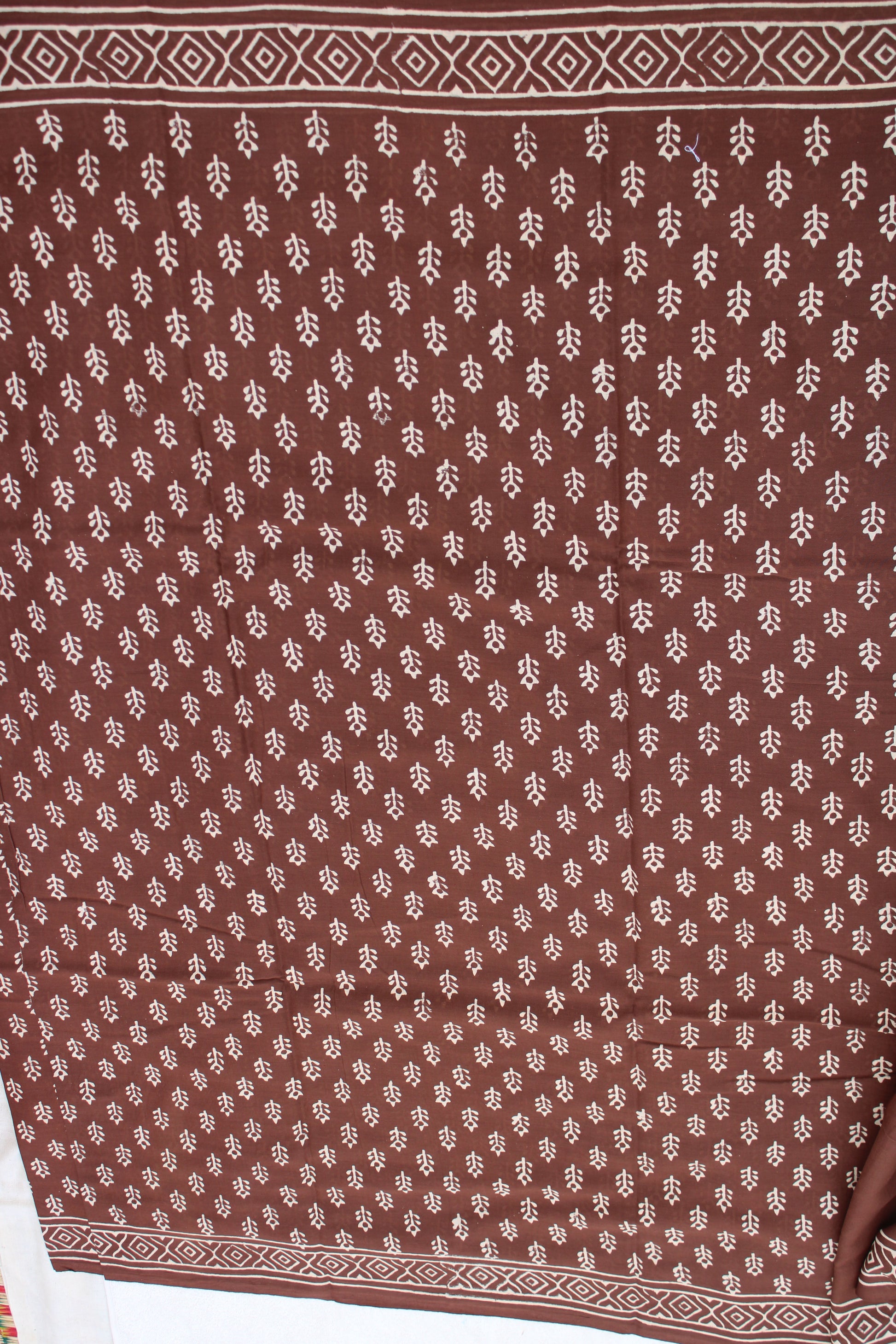 This brown saree features elegant white block prints on pure mul cotton, offering breathable comfort ideal for long office hours. Its lightweight fabric ensures ease of movement, making it a perfect choice for professional settings where style meets practicality.