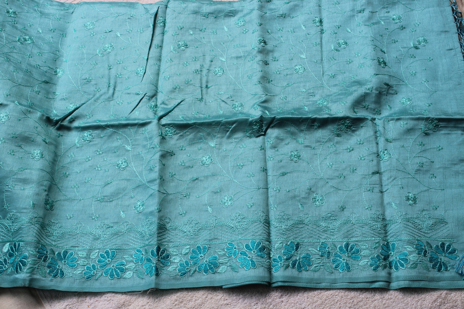 Elevate your wardrobe with this Light Blue Tusser saree, featuring delicate floral embroidery that highlights exquisite craftsmanship. The natural texture of Tusser silk combined with intricate flower motifs lends a sophisticated charm, perfect for festive occasions or elegant gatherings. Its breathable fabric ensures comfort while the timeless design enhances your graceful silhouette with expert finesse.