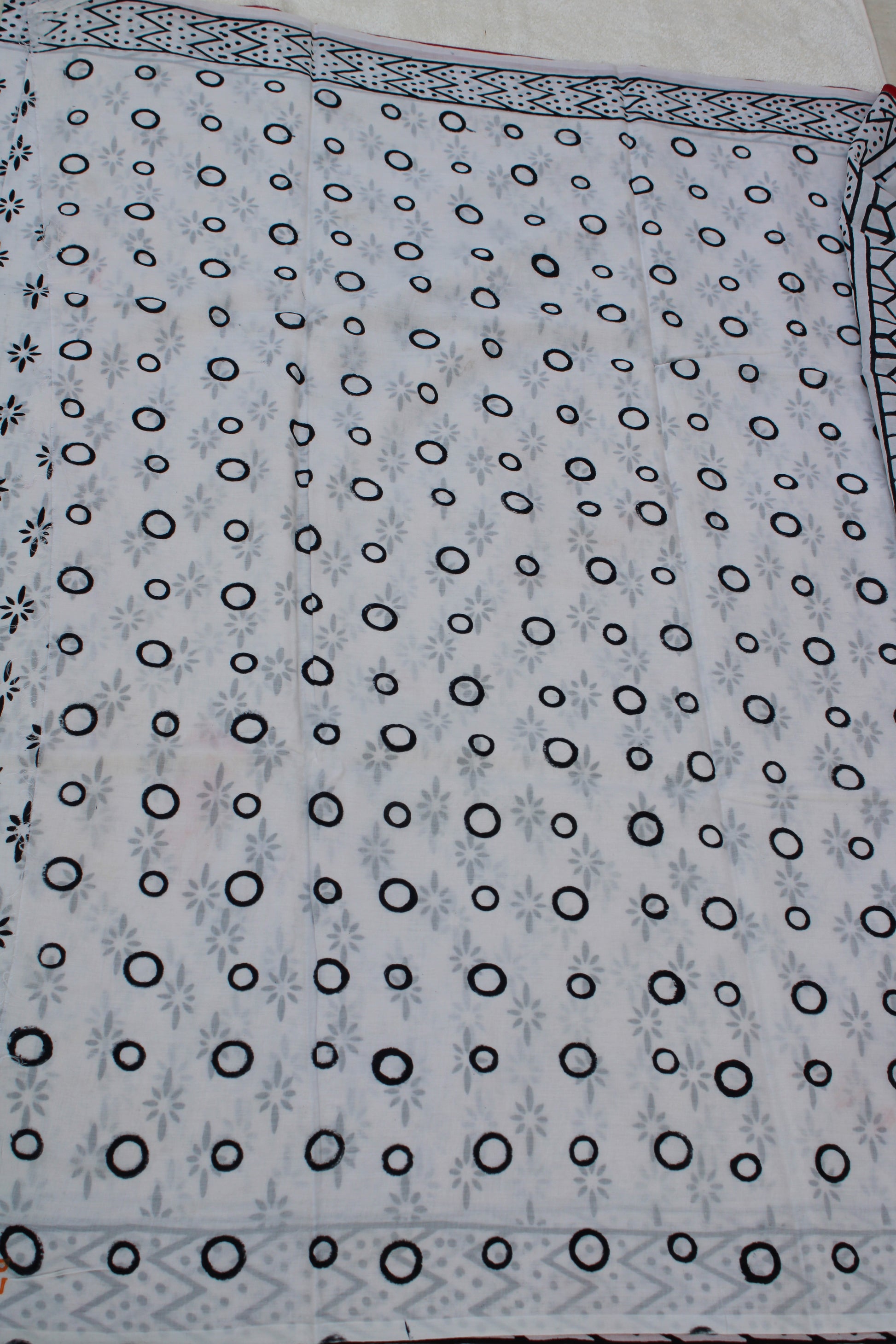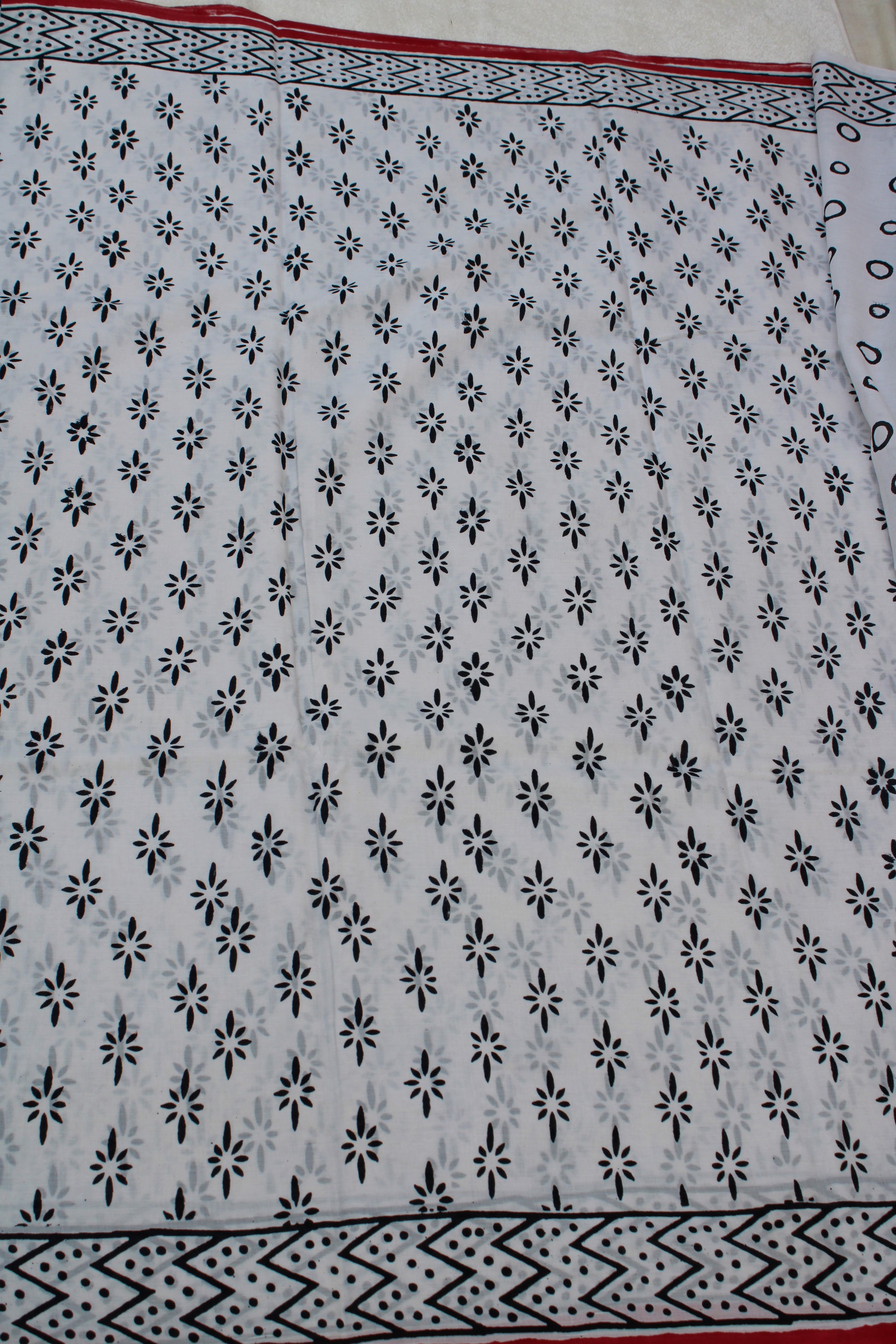 This white Mul cotton saree features elegant black flower hand block prints, combining traditional craftsmanship with modern style. Crafted from pure Mul cotton, it ensures breathable comfort ideal for long office hours or professional settings. Its lightweight fabric and timeless design make it a perfect choice for all-day wear, offering both sophistication and ease.