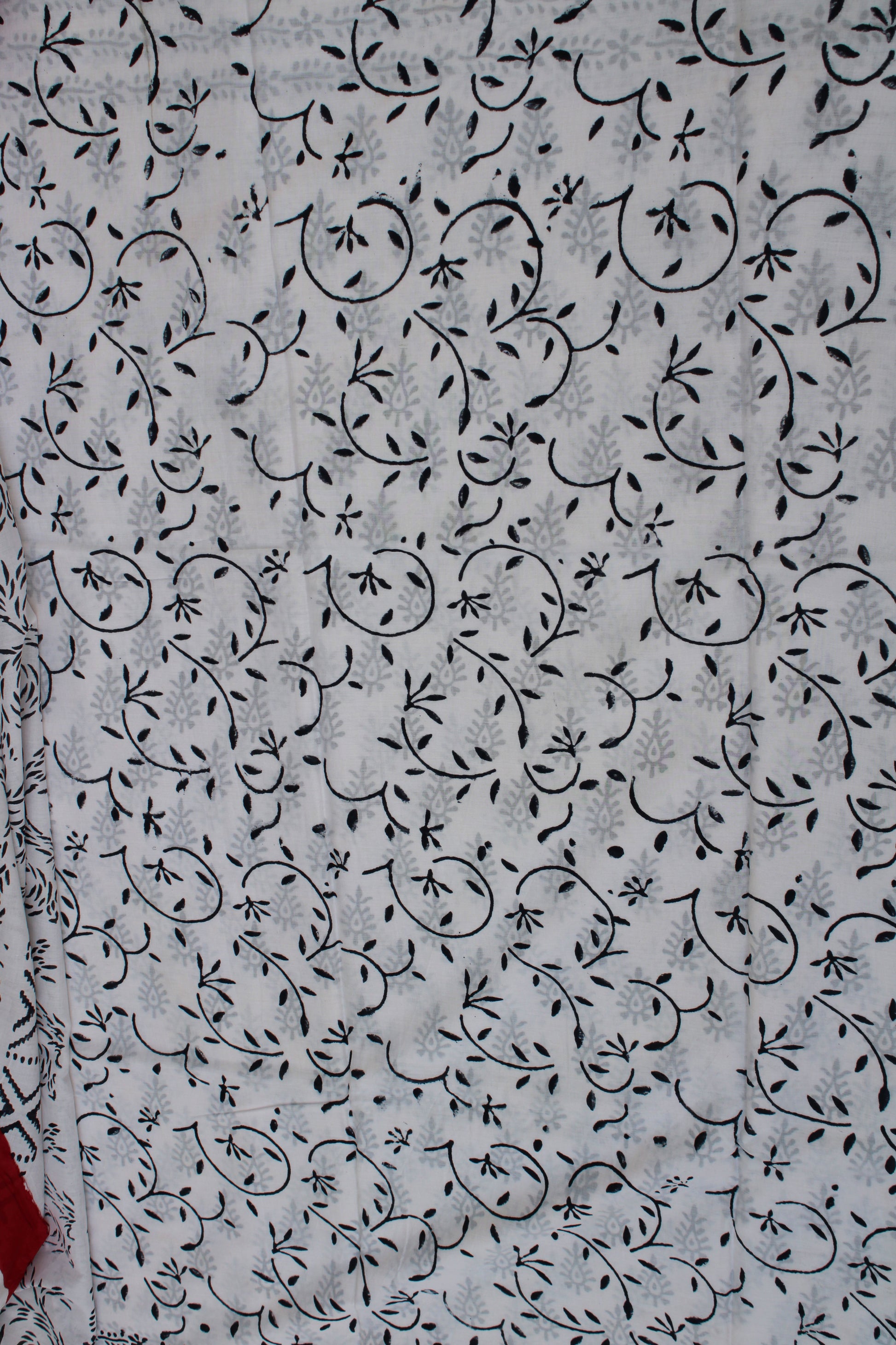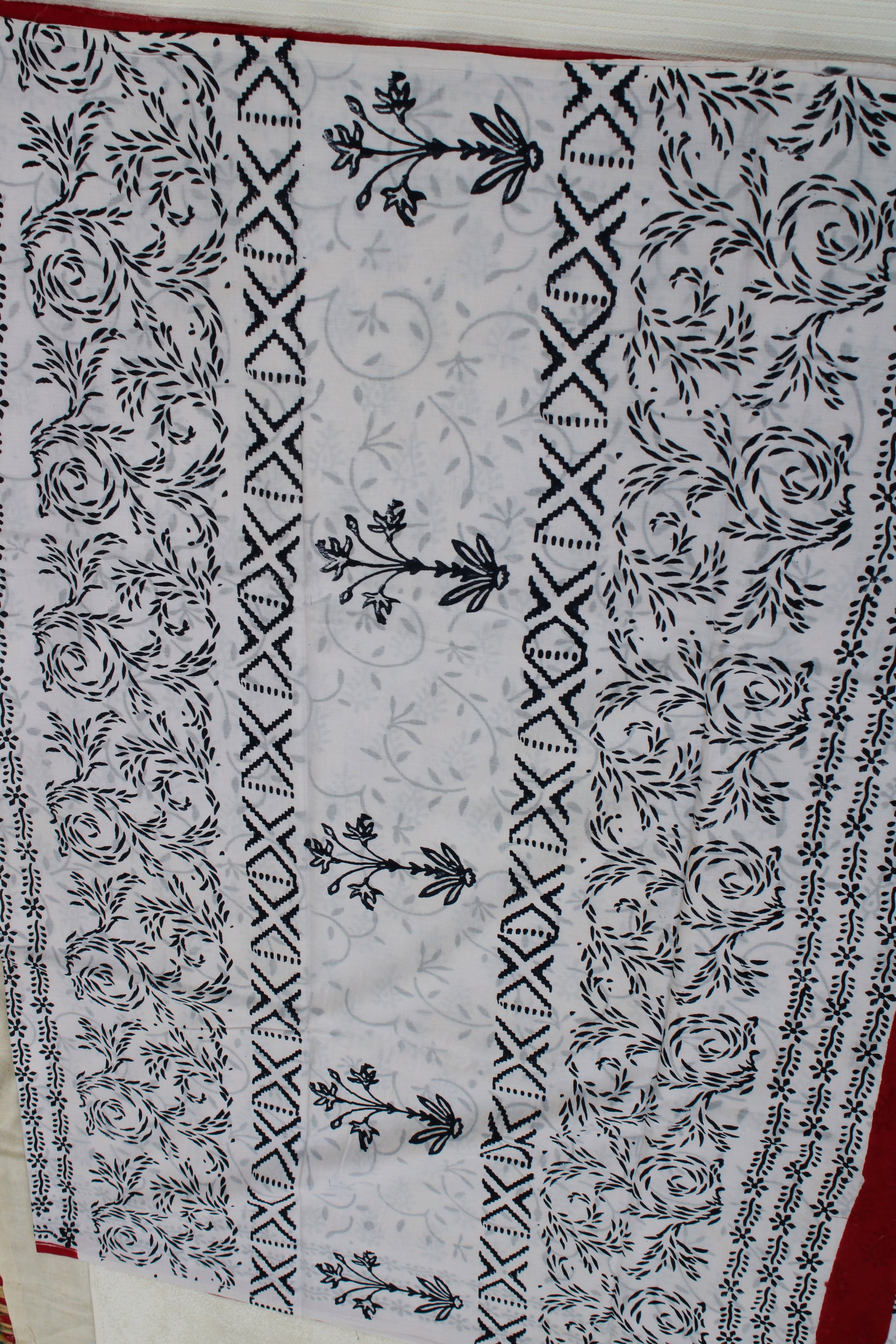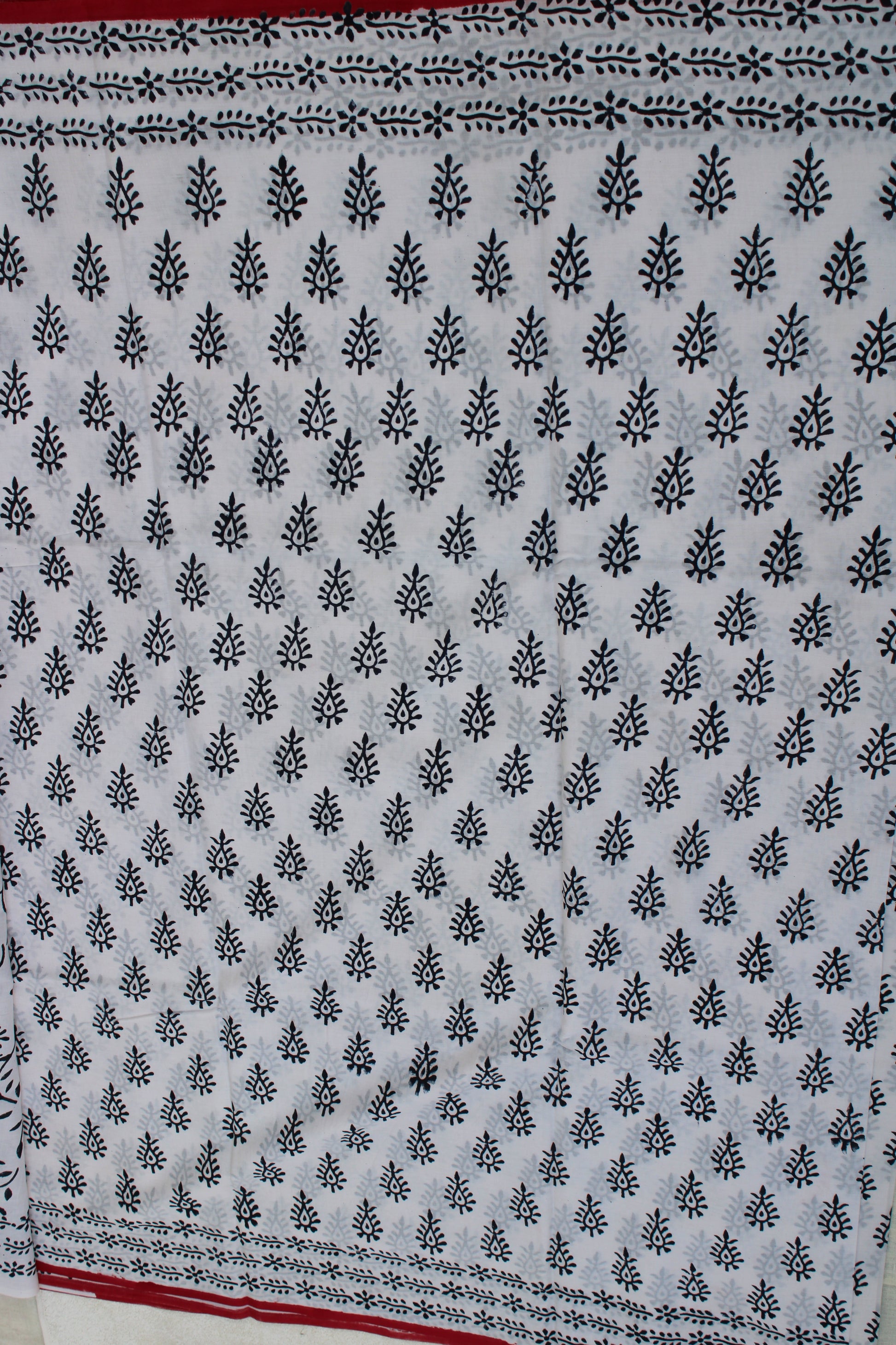 This white mul cotton saree features elegant black peacock leaf hand block prints, combining traditional craftsmanship with modern style. Designed for professional and office wear, it offers breathable comfort for all-day use while maintaining a polished, sophisticated look. Ideal for those seeking a blend of cultural artistry and practical wearability.