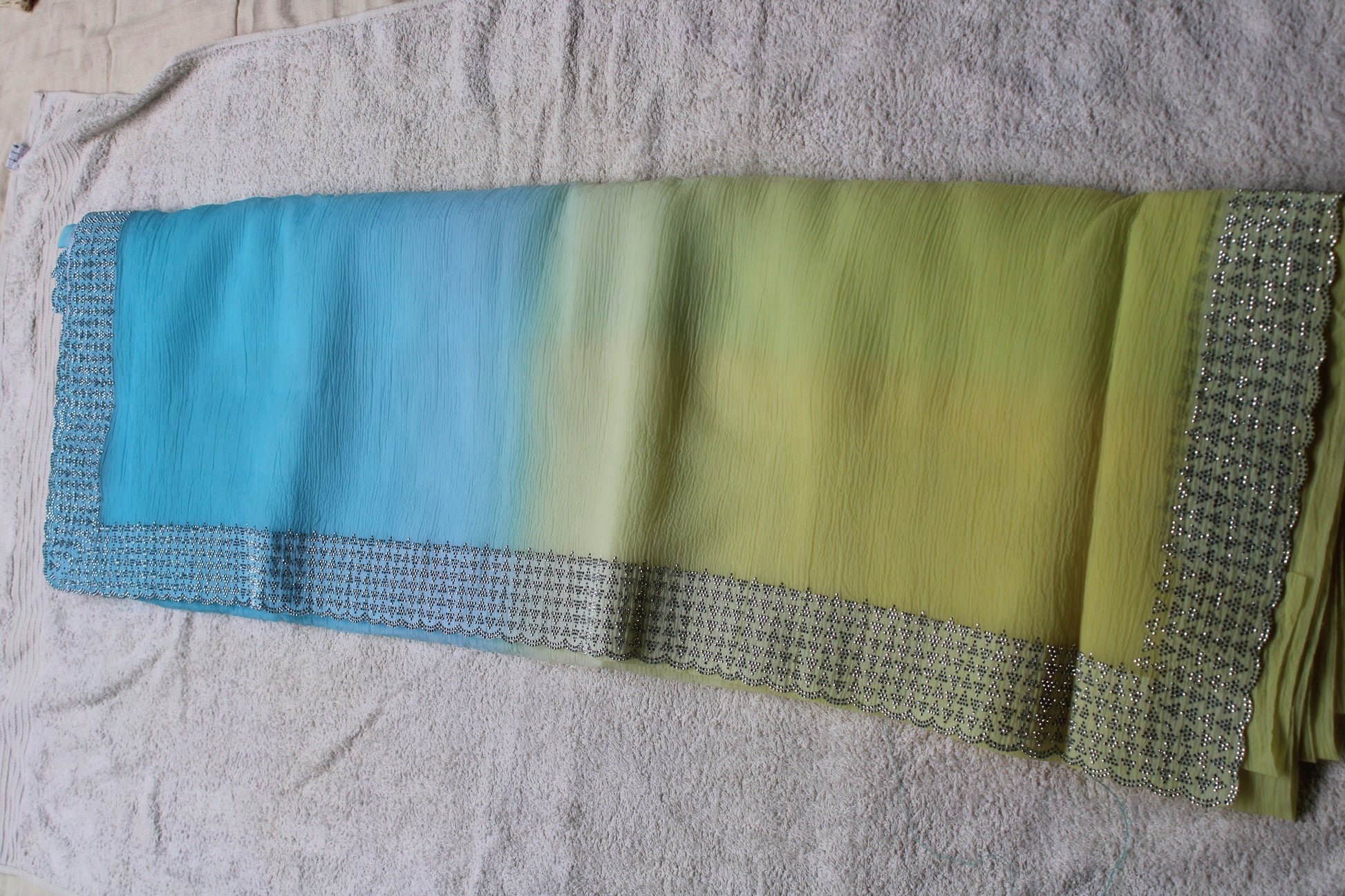Blue and Yellow Crushed georgette shaded saree
