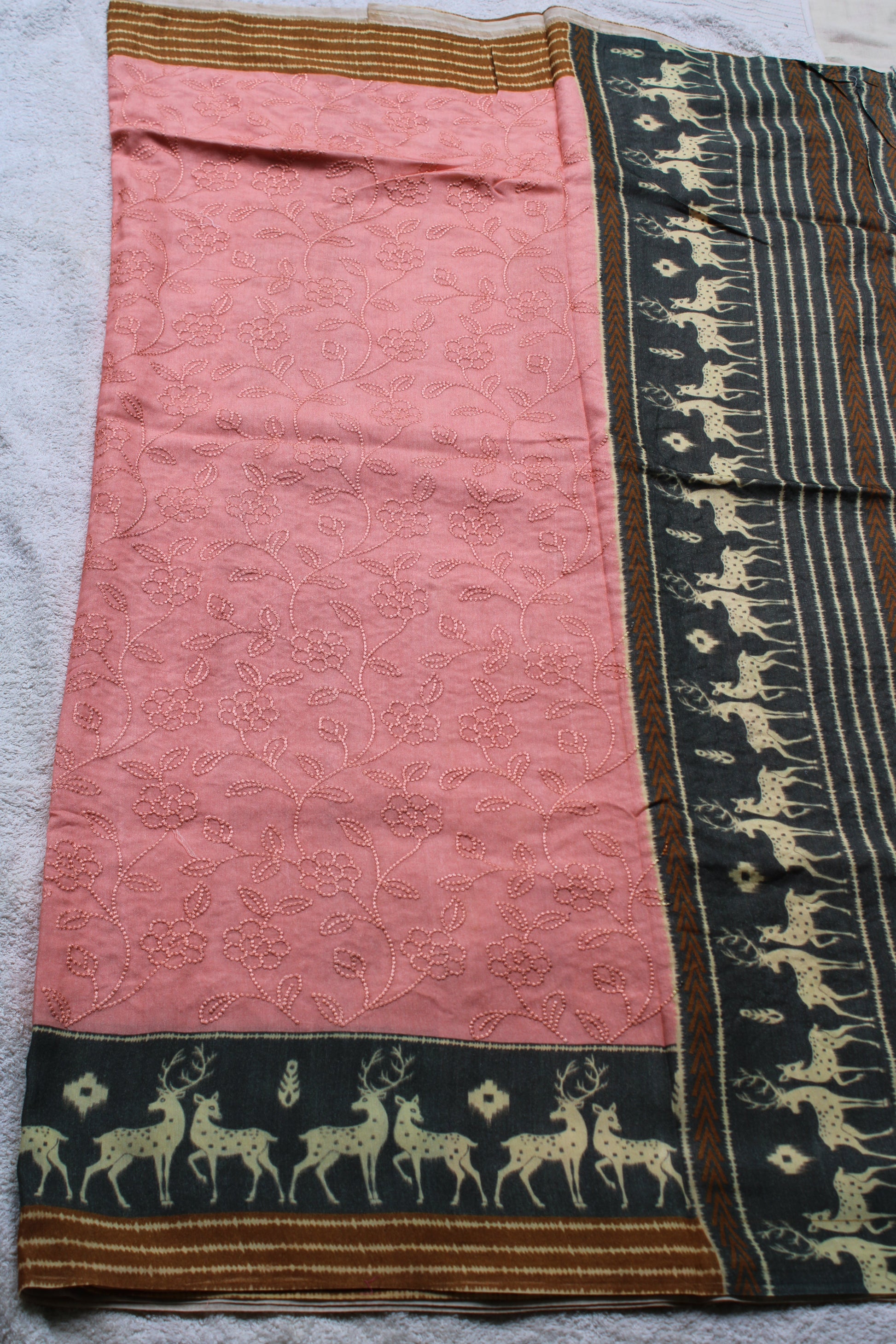 This peach Tusser crape saree features exquisite deer motif borders and delicate flower zaal embroidery on the body. Its very soft texture ensures comfort while the fabric is tailored to provide a body-hugging, slim silhouette, making it ideal for a graceful and elegant appearance.