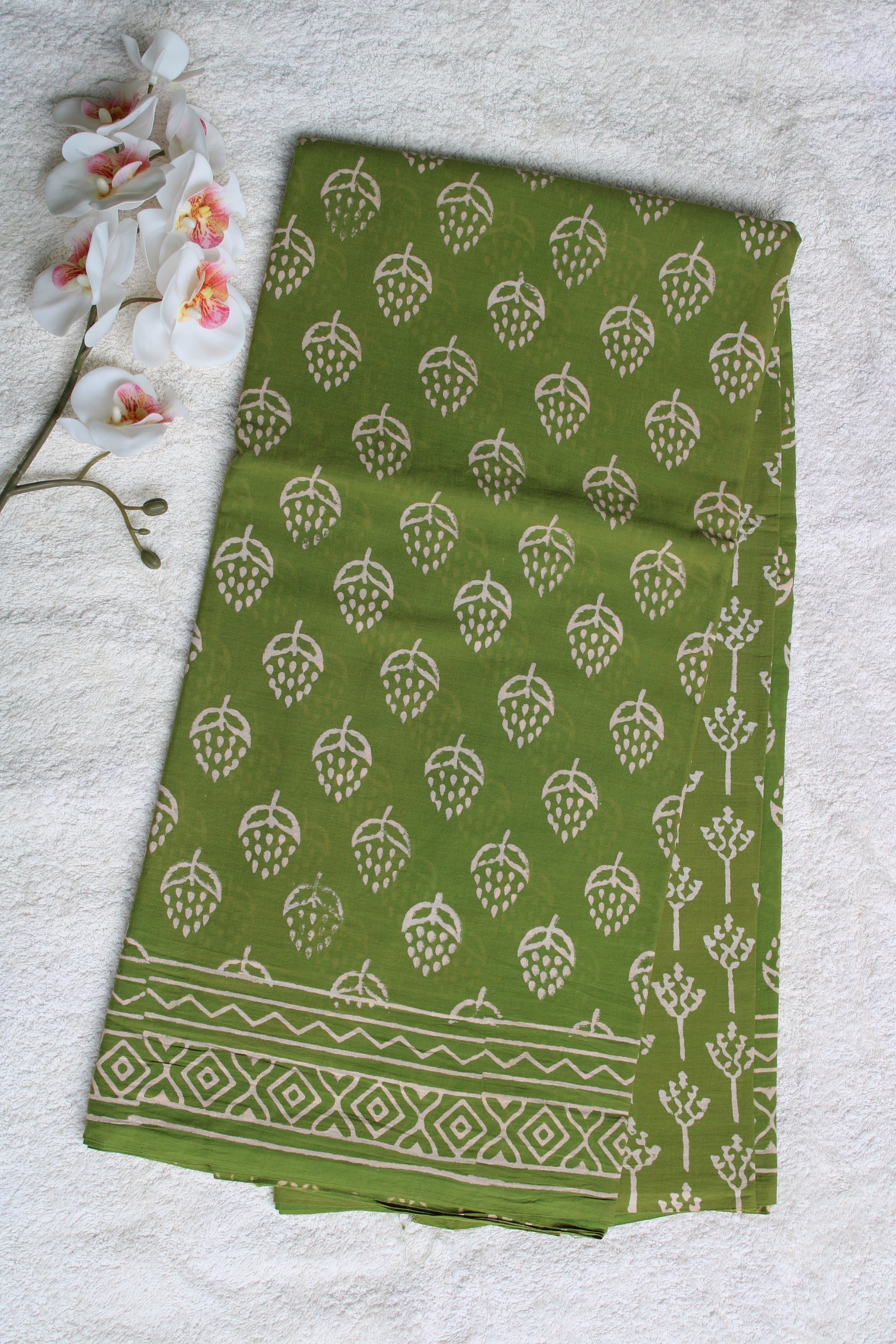 This green saree, crafted from pure mul cotton fabric, features exquisite block-printed flower motifs throughout the body. Its breathable, lightweight texture ensures comfort, while the traditional printing technique adds a timeless elegance. Ideal for everyday wear or casual occasions, this saree combines artistry and practicality for a refined, natural look.