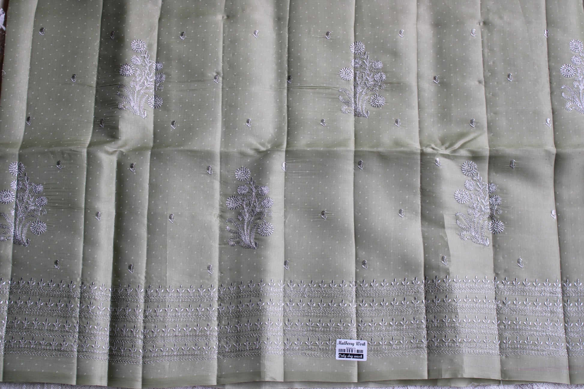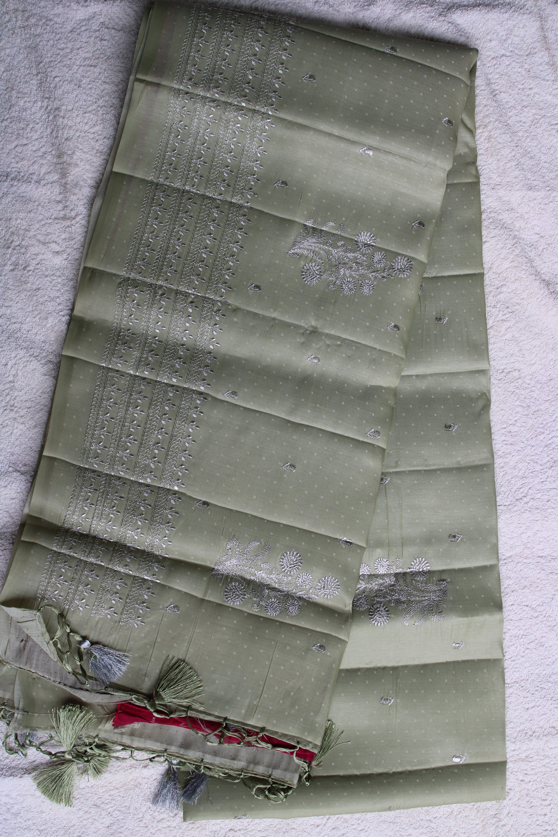 Green Dot Tusser saree with zari embroidery and contrast blouse