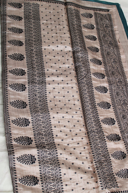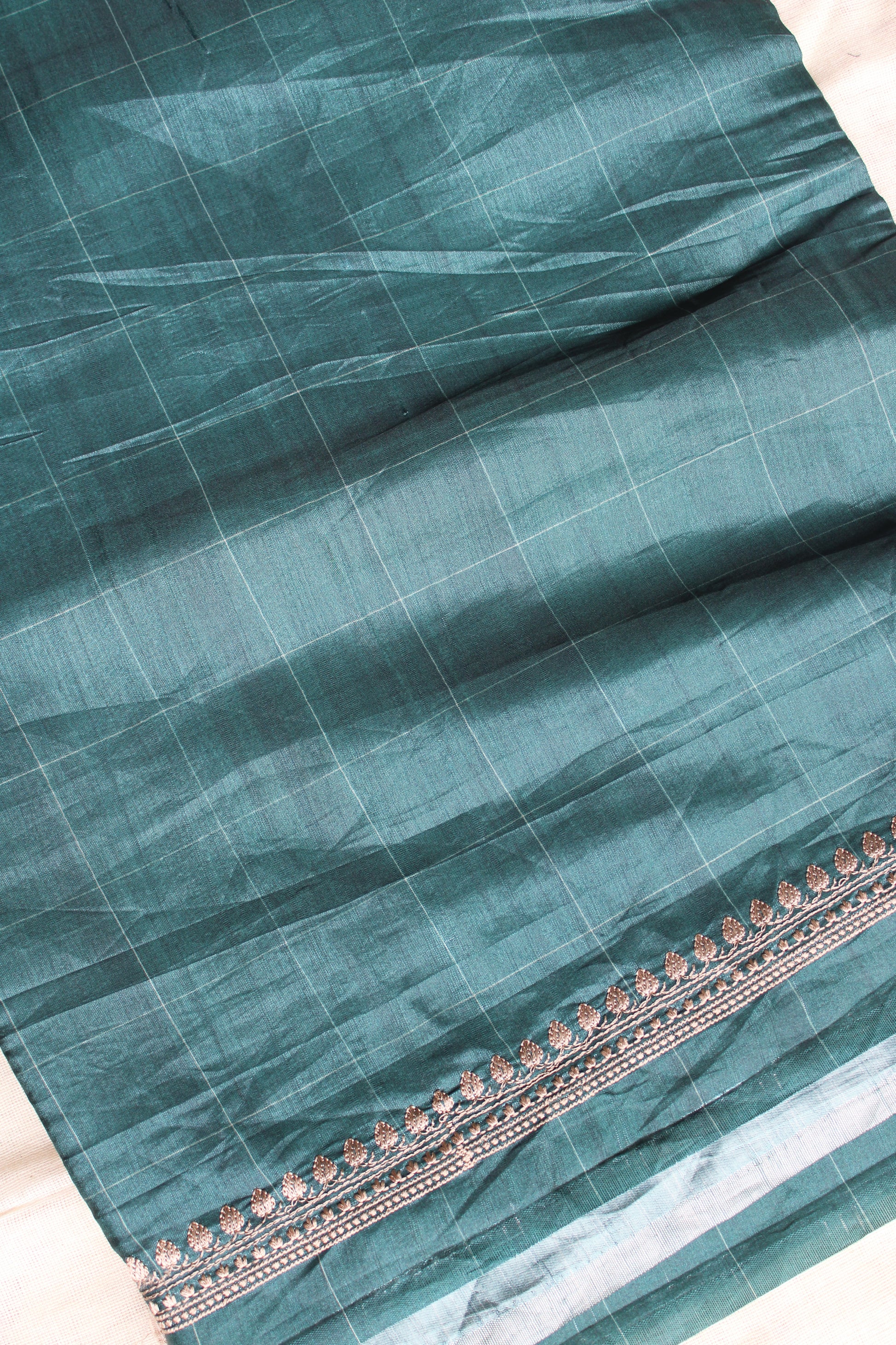 This green soft Tusser saree features delicate small flower embroidery along the border and an intricately embroidered pallu, combining elegance with subtle charm. Its lightweight fabric and body-hugging fit make it ideal for small gatherings and professional office events, offering comfort without compromising style. Perfect for those seeking a refined yet understated look.