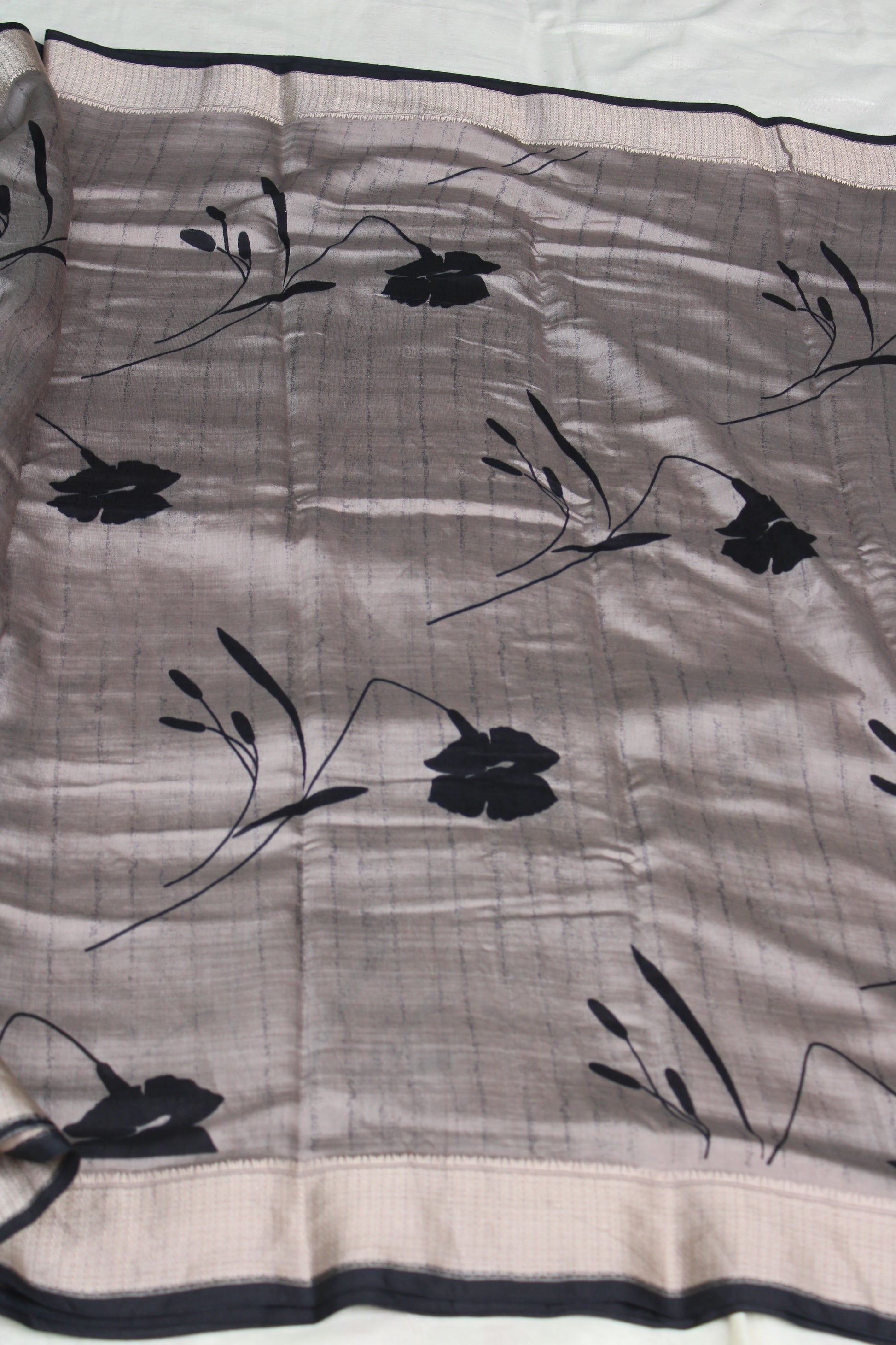 This elegant Tussar Crape saree features a delicate floral design, combining traditional fabric with contemporary style. The natural texture of tussar silk offers a lightweight, breathable feel, making it perfect for festive occasions or formal gatherings. Its graceful drape enhances silhouette, while the floral patterns add a subtle charm, reflecting expert craftsmanship and timeless appeal.