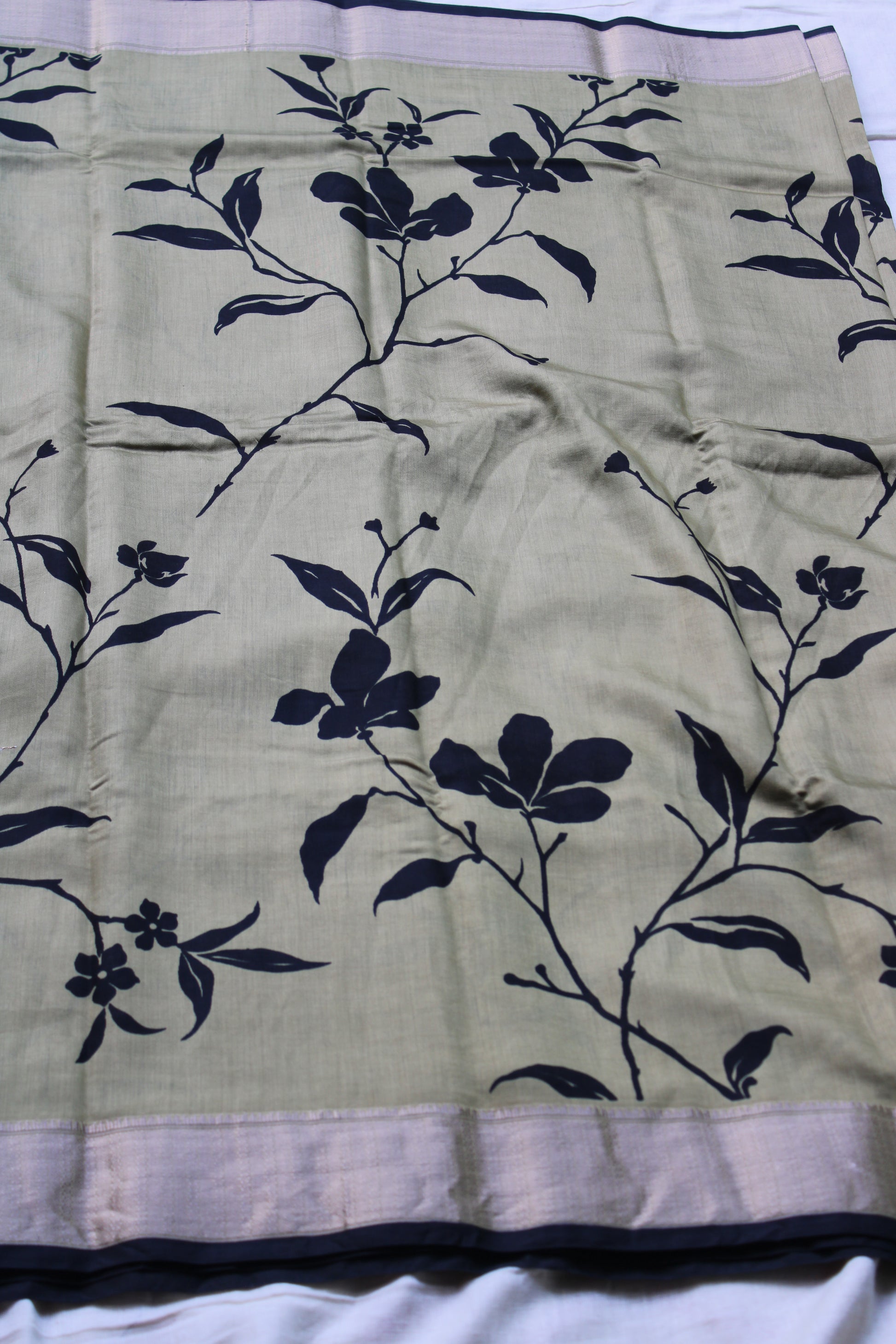 This elegant Green Tussar Crape saree features a delicate floral design, combining traditional fabric with contemporary style. The natural texture of tussar silk offers a lightweight, breathable feel, making it perfect for festive occasions or formal gatherings. Its graceful drape enhances silhouette, while the floral patterns add a subtle charm, reflecting expert craftsmanship and timeless appeal.