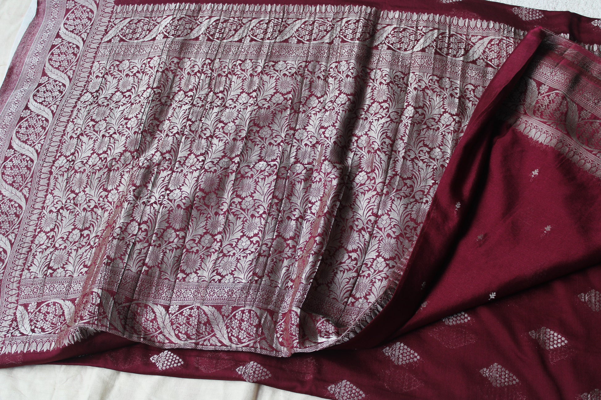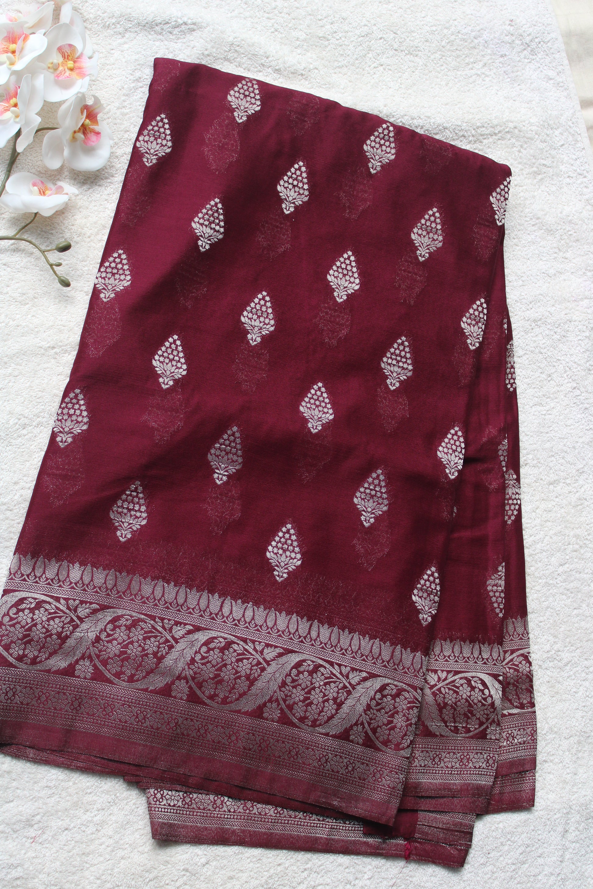 Elevate your wardrobe with this Maroon Banarasi Mashru crape georgette saree, featuring an elegant butta design. Crafted from a blend that offers the rich texture of Banarasi with the lightweight comfort of georgette, this saree drapes effortlessly, making it ideal for both traditional occasions and contemporary style. Its breathable fabric ensures easy wear throughout the day, while the timeless floral pattern keeps you effortlessly fashionable. A perfect balance of heritage craftsmanship and modern appeal.
